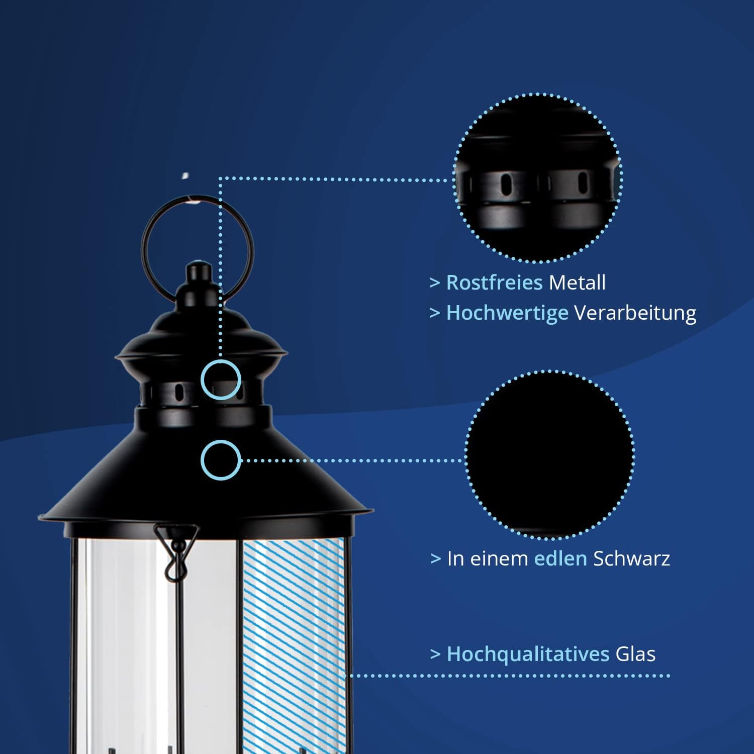 - HOCHWERTIGES MATERIAL 🕯️ Die Laterne besteht aus hochwertigem, langlebigem und robustem Metall. Das verwendete Glas hält, wie auch das Metall, hohe Temperaturen und Witterung aus, wodurch die vielseitige Nutzung gewährleistet ist.