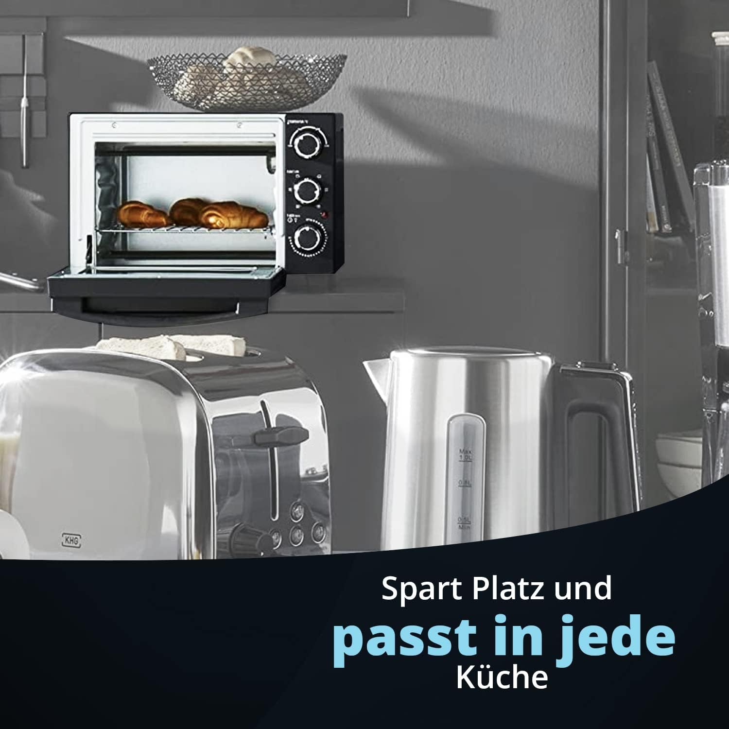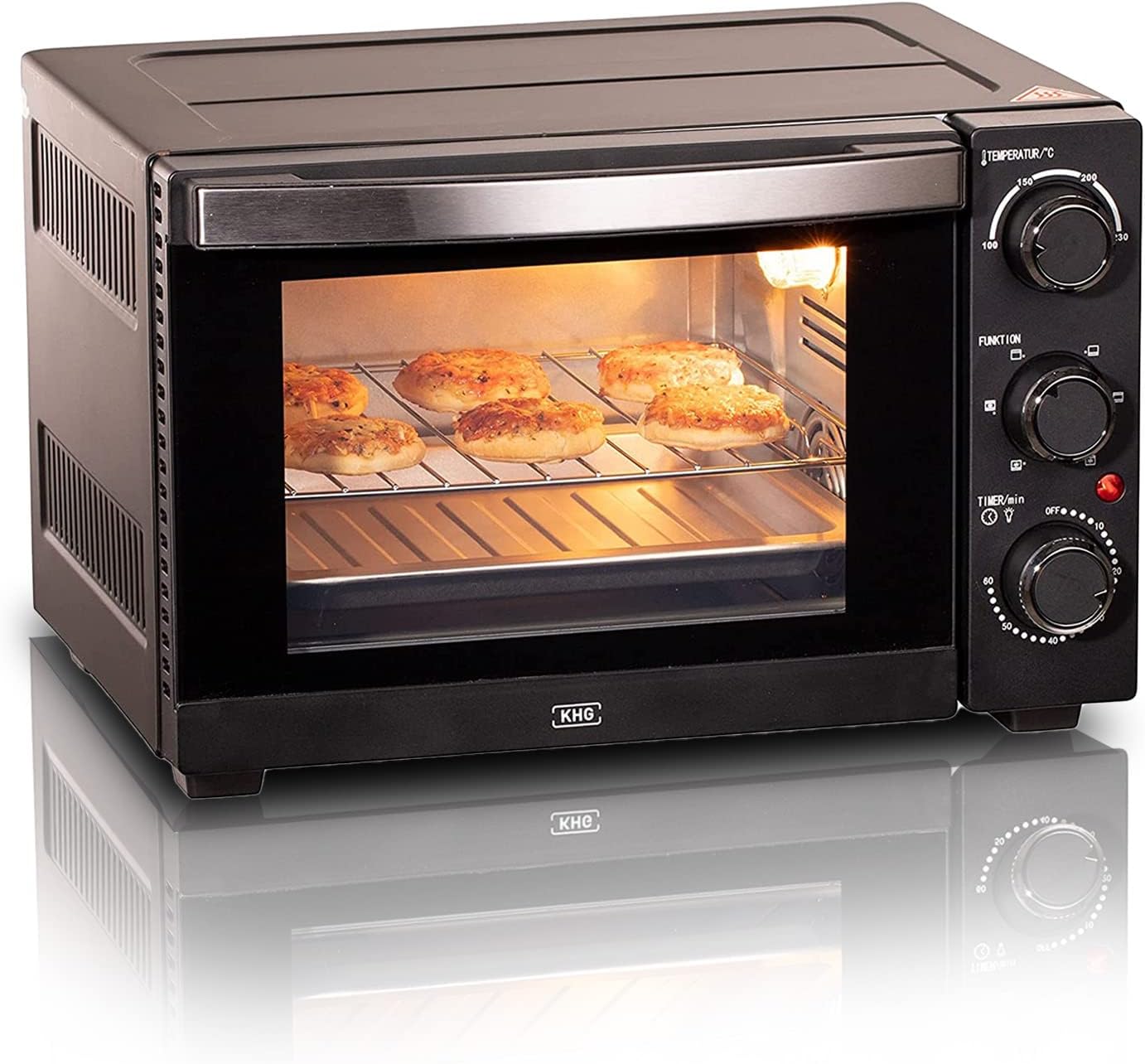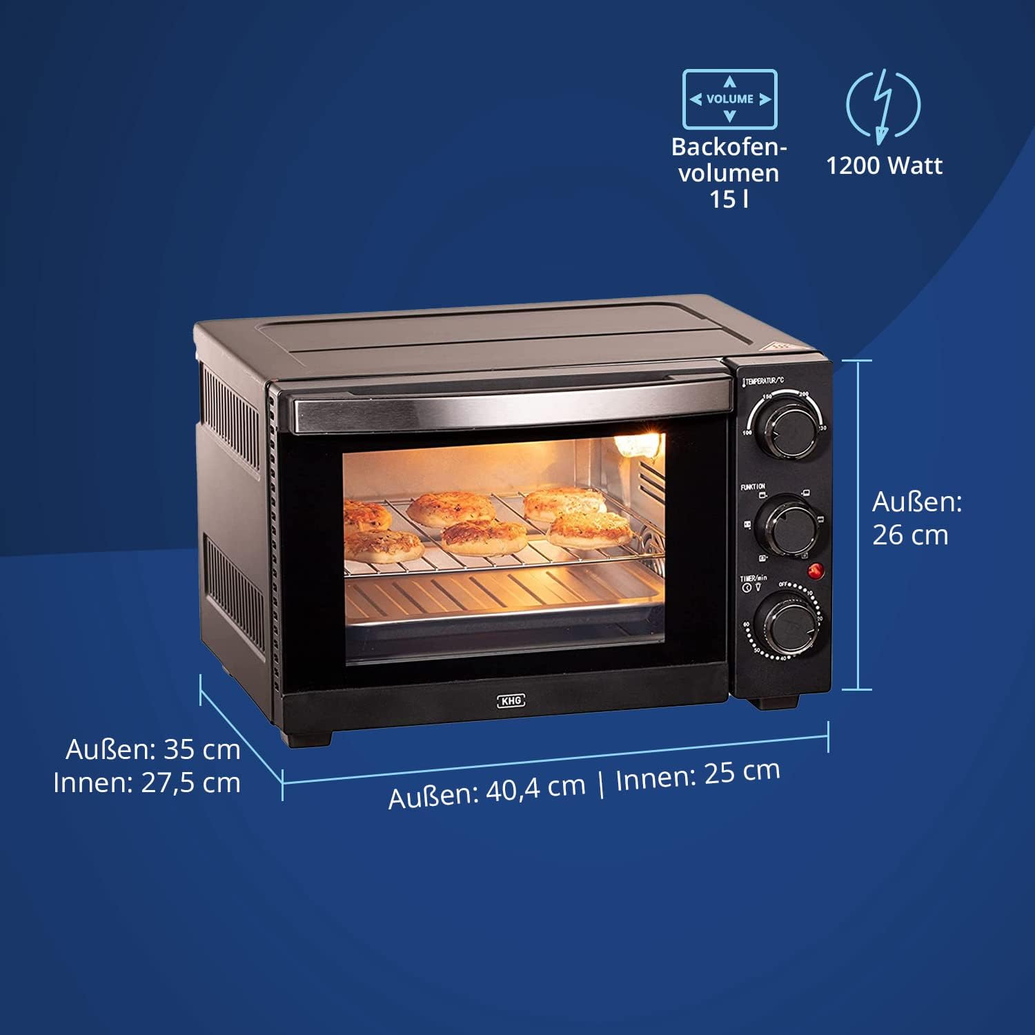 - KOMPAKT & GERÄUMIG - Mit einer Breite von 40,4 cm, einer Höhe von 26,5 cm und einer Tiefe von 35 cm passt der KHG-Minibackofen in nahezu jede Küche. Dennoch bietet der Innenrauf mit einer Tiefe von 25 cm, einer Breite von 27,5 und 15 Liter Nutzinhalt genug Raum für kleine Gerichte.
