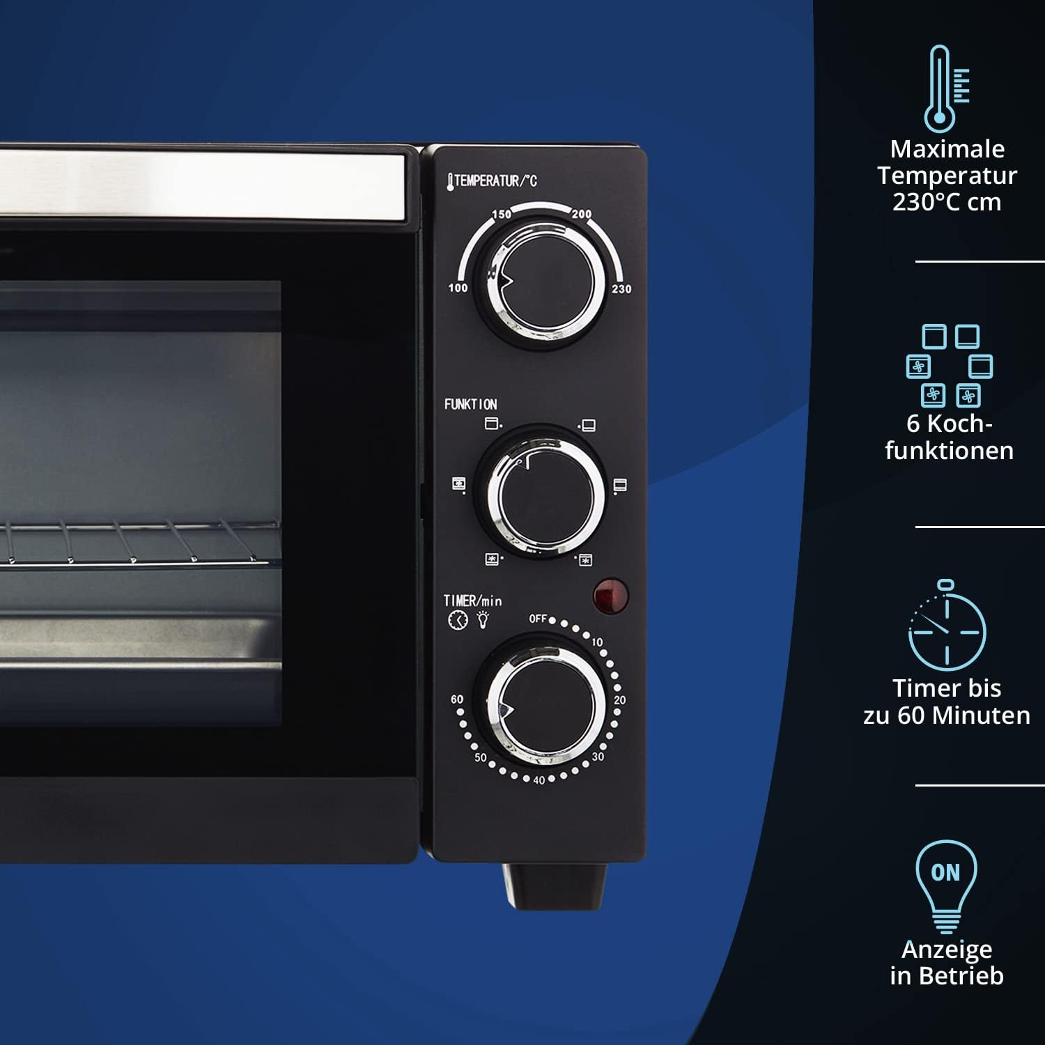 - FLEXIBEL & VIELSEITIG - Über den mittleren Funktionsschalter auf der rechten Seite können die 6 verschiedenen Bedienungsstufen, darunter Ober-/Unterhitze, Umluft und Kombinationen der genannten, ausgewählt werden, welche das flexible Zubereiten von Speisen enorm erleichtert.