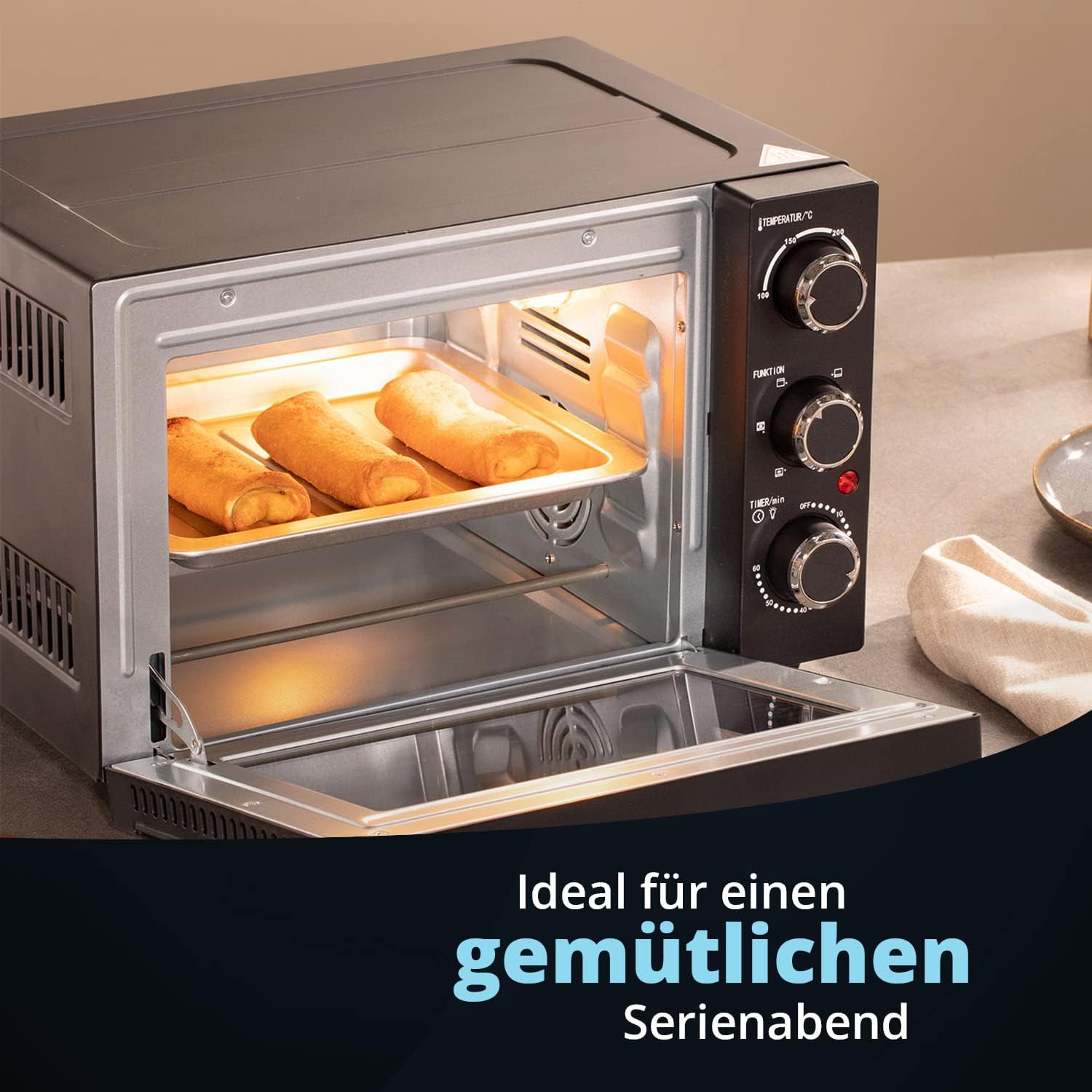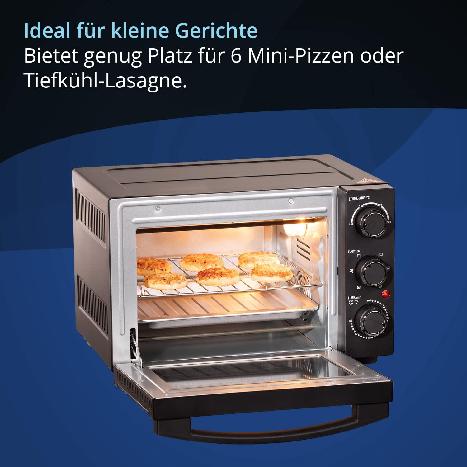 - MAXIMALE LEISTUNG - Mit einer maximalen Leistung von 1.200 W hat der Minibackofen mehr als genug Leistung, damit jegliche Speisen im Handumdrehen erhitzt werden können.