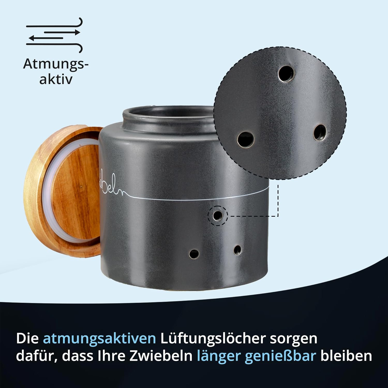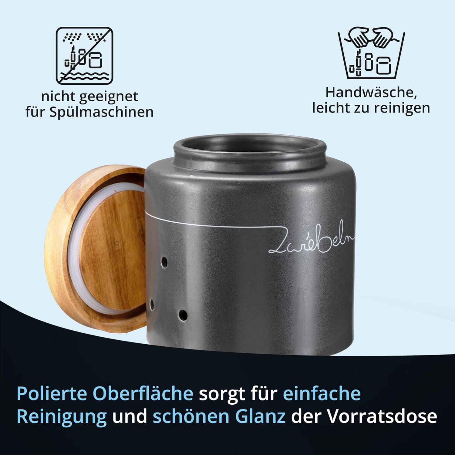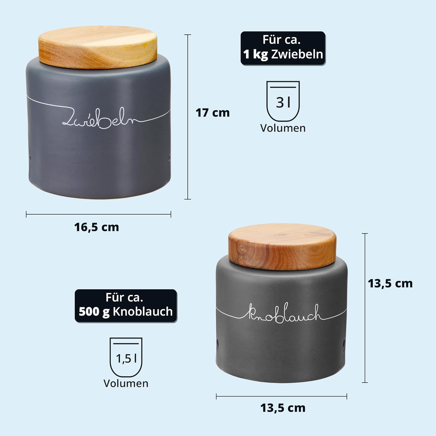 - 𝗠𝗼𝗱𝗲𝗿𝗻𝗲𝘀 𝗗𝗲𝘀𝗶𝗴𝗻 ✅ Unser Set aus Zwiebel- und Knoblauch-Aufbewahrung präsentiert sich im zeitlosen Anthrazitgrau mit einem edlen Holzdeckel aus echtem Bambus. Die Zierschrift verleiht ihm einen Hauch von