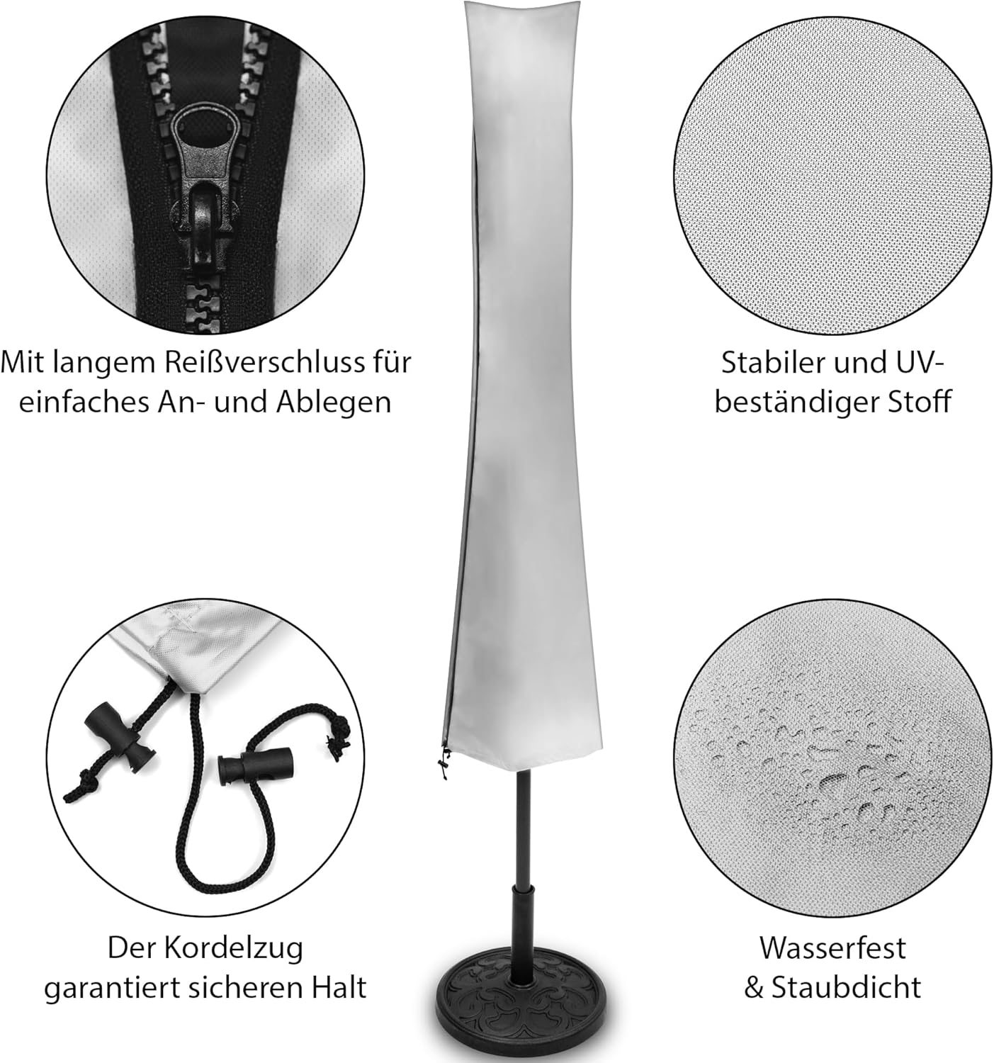 - FÜR JEDES WETTER GEEIGNET: Bei der Planung war uns besonders wichtig, dass die Sonnenschirmhülle besonders lichtbeständig ist, d.h. auch bei langer Sonneneinstrahlung bleibt die Farbe erhalten. Die Abdeckplane hat einen langen, wasserdichten