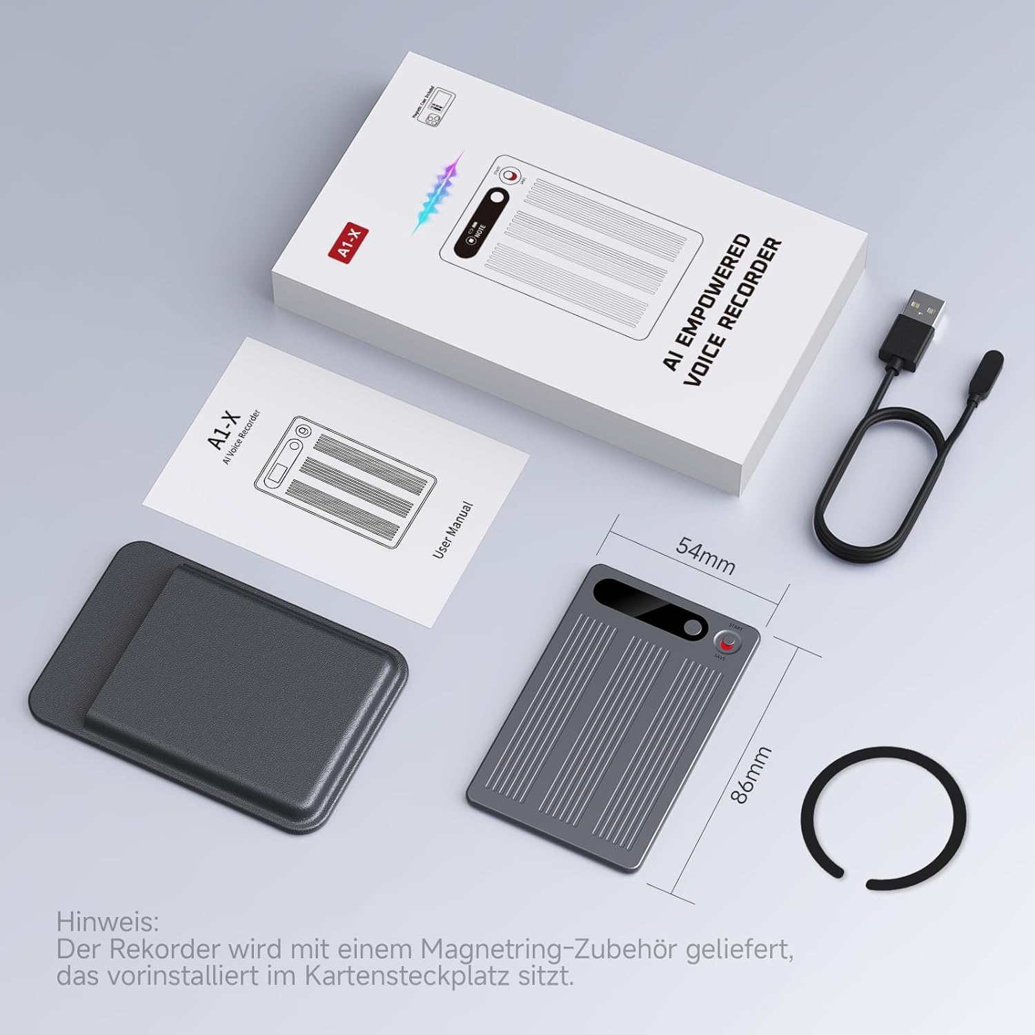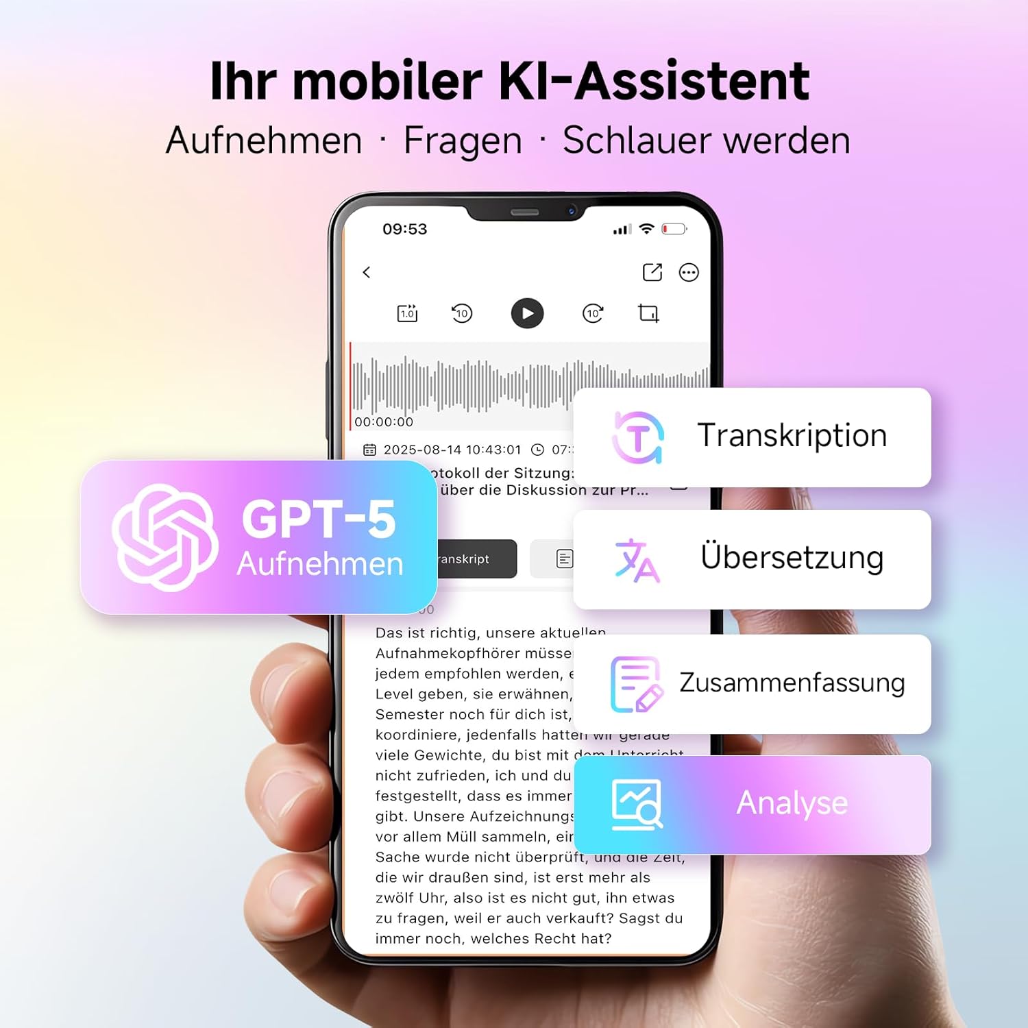 - Intelligente Spracherkennung mit KI-Transkription: Dieses KI Diktiergerät nutzt GPT-5-KI, um Sprache automatisch zu transkribieren, zusammenzufassen und als Mindmap darzustellen. Ob im Meeting oder am Telefon – er verwandelt gesprochene Inhalte sofort