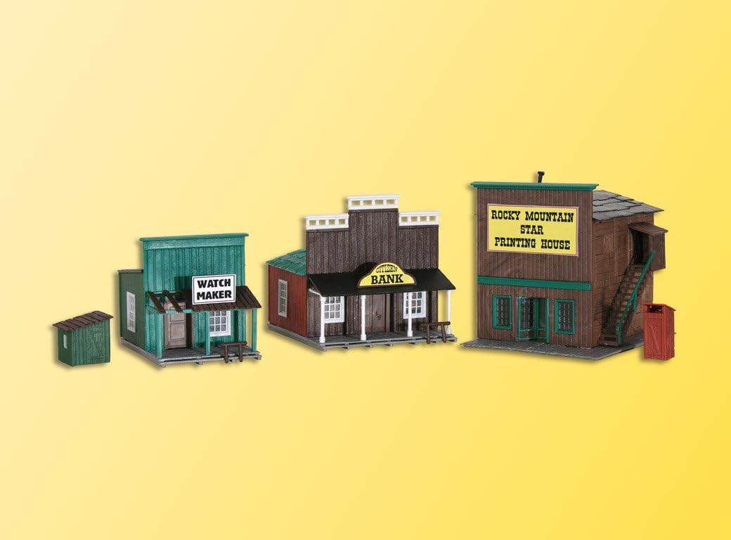 PRODUKTBESCHREIBUNGEN Nostalgieserie „Der Wilde Westen“. Drei Bankgebäude (Bausätze), passend zu den Cowboys aus der Serie eMotion von Viessmann. Abmessungen: 11 x 8,5 x 9,5 cm, 10 x 8 x 9 cm, 8 x 5,5 x 6,6 cm Mehr