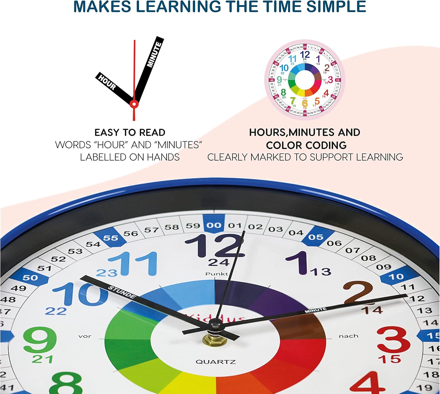 - Perfekte Lernuhr für Kinder: Entwickelt für Mädchen und Jungen, mit "Stunde" und "Minute" beschrifteten Zeigern. Ideal ab 5 Jahren