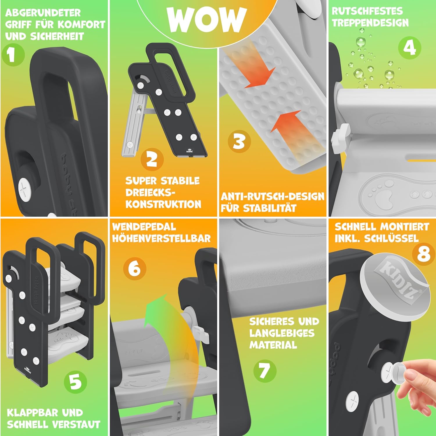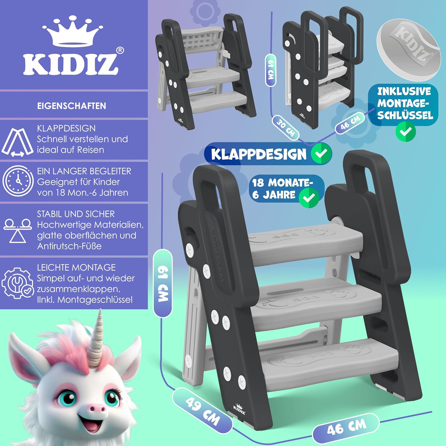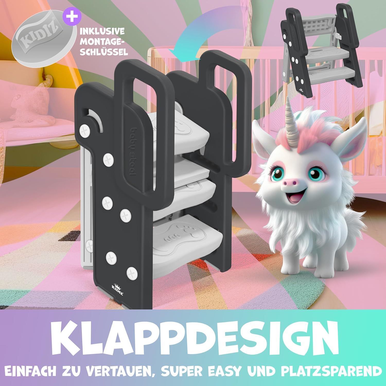 - ๐๐๐๐๐๐๐๐๐๐๐ ๐ ร๐ ๐๐๐๐๐๐๐๐๐๐๐๐๐๐: Das Klappdesign des KIDIZ Tritthockers ermรถglicht eine mรผhelose, flexible Nutzung sowie einfache Aufbewahrung, was ihn zu einem