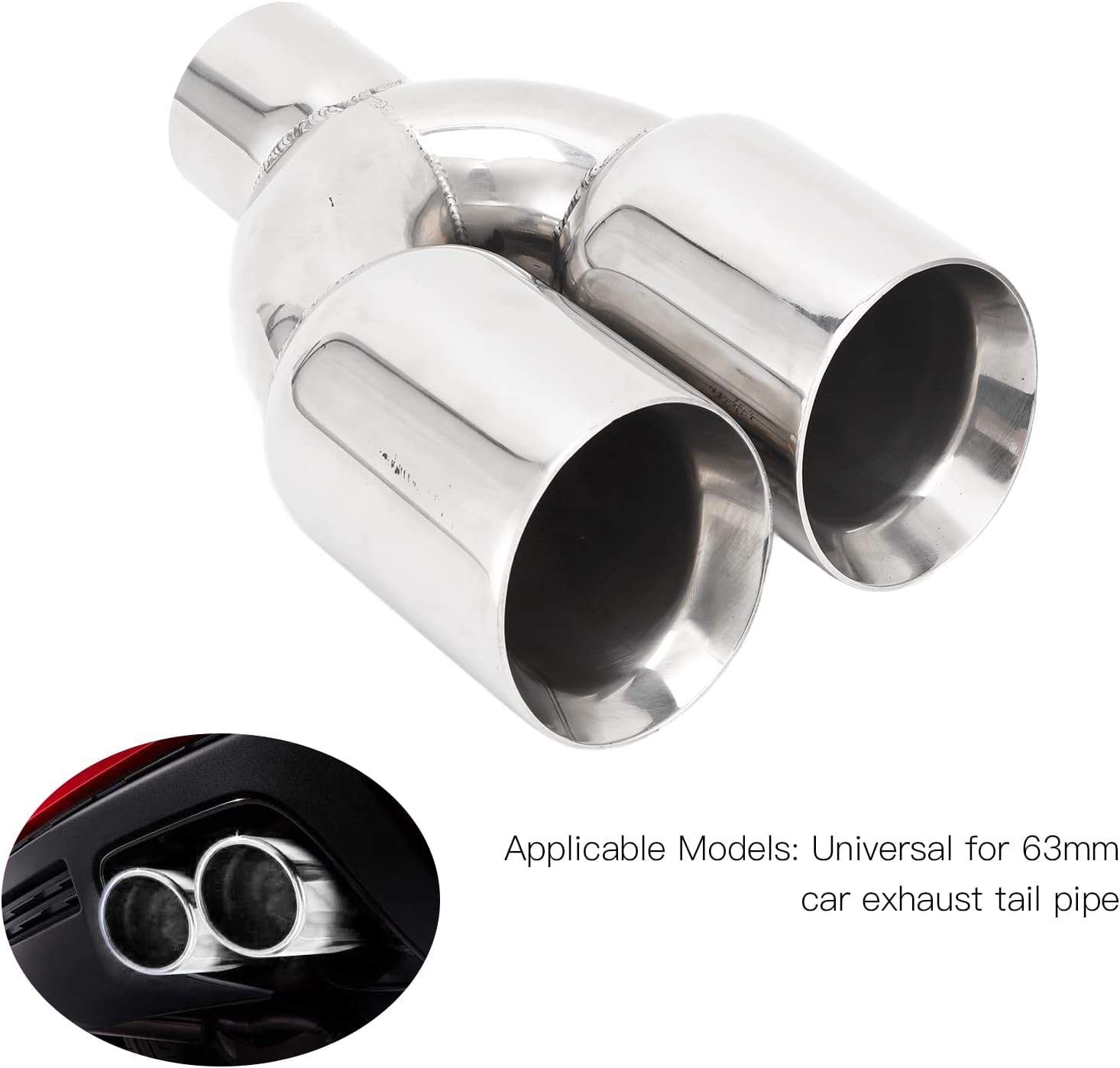 - Universelle Anwendung -------- Auto-Doppelauslass-Endrohr ist ein universeller Typ, der für 63 mm / 2,48 Zoll Ansaugtrucks oder Auto-Auspuff-Endrohr-Schalldämpferspitzen passt.