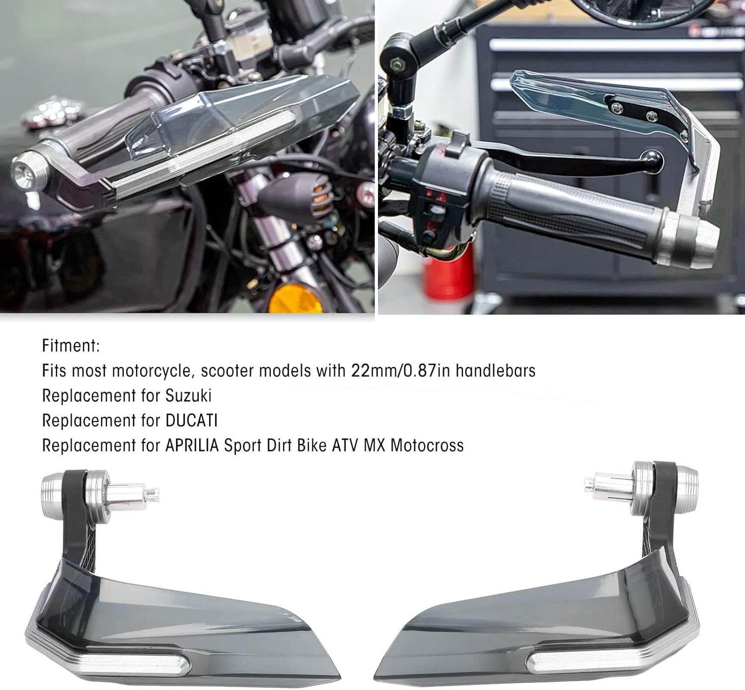 - Ausstattung: Motorrad-Handschützer passen für die meisten Motorrad-, Chopper- und Rollermodelle mit 22-mm-Lenker, z. B. Ersatz für Suzuki, Ersatz für DUCATI und Ersatz für APRILIA Sport Dirt Bike ATV MX Motocross. Bitte bestätigen Sie vor der
