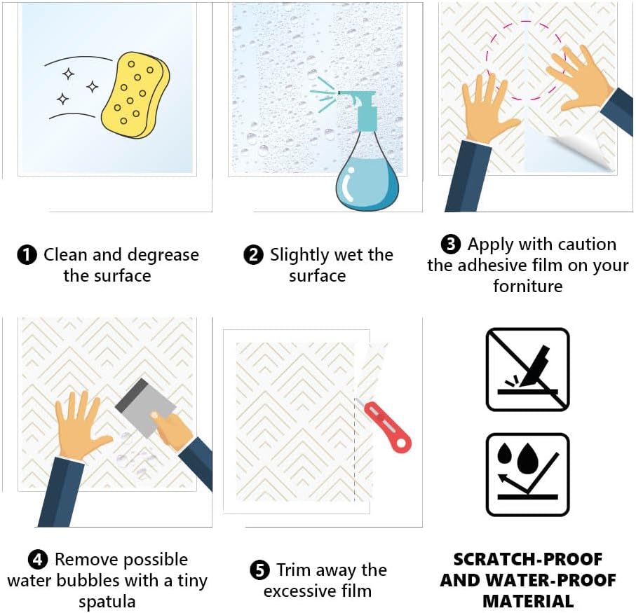 - Wasserfestes kratzfestes Klebematerial, kurzfristig repositionierbarer Kleber, der Kleber wird nach 24 Stunden aktiviert und wird dauerhaft. Es hinterlässt jedoch keine Rückstände, wenn Sie sich entscheiden, es von einem Möbelstück zu entfernen