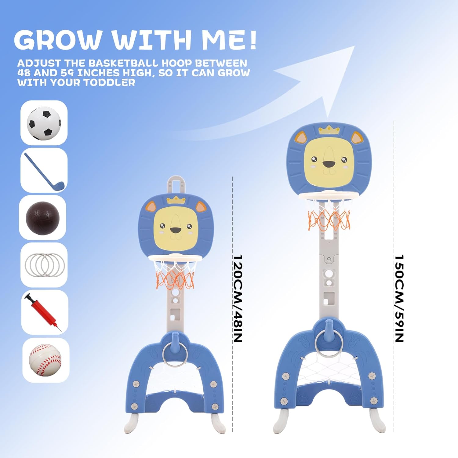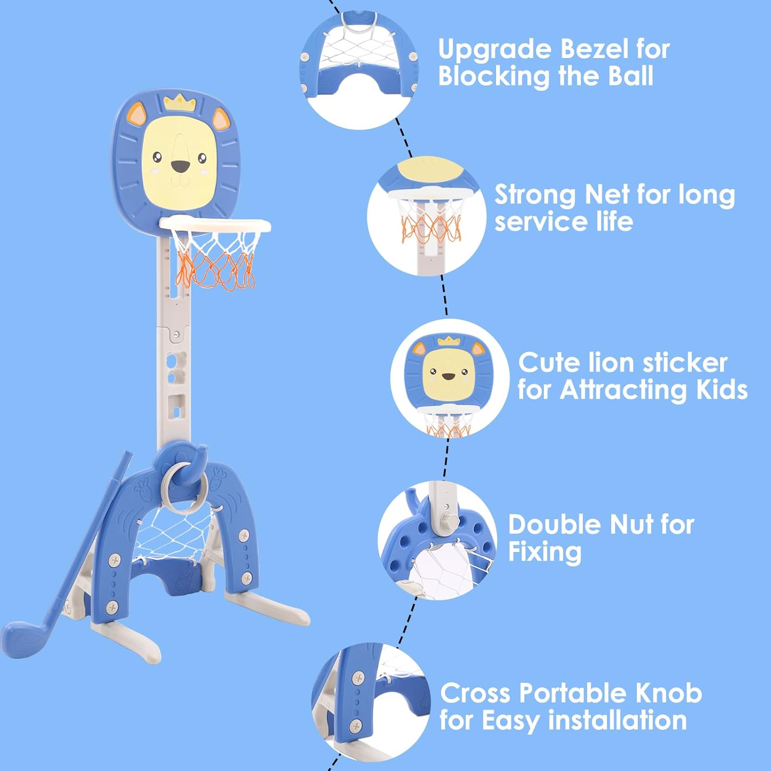 - 【4-in-1-Aktivitätszentrum】Dieser Basketballkorb für Kinder ermöglicht 4 Sportarten: Golf, Basketball, Fussball und Ringwurf. Enthält 1 Basketball, 1 Fussball, 4 Ringe, 1 Golfball, Golfschläger und 1 Pumpe. Das multifunktionale Spiel ermöglicht