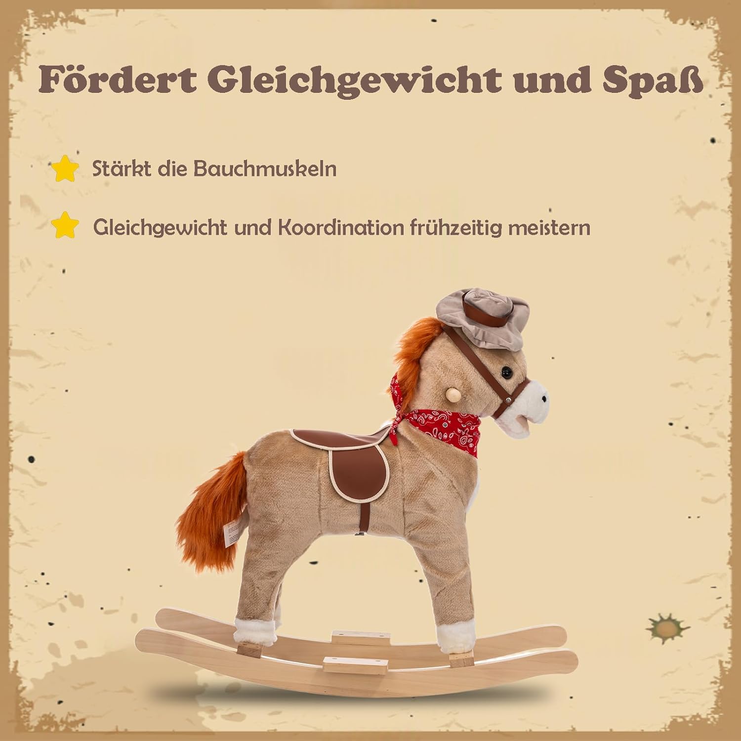 - -Aussehen: Es verfügt über einen flauschigen Pferdekörper in einem klassischen Cowboy-Farbschema. Das Pferd trägt ein rotes Halstuch um den Hals, das den legendären Look eines Cowboy-Zubehörs nachahmt.