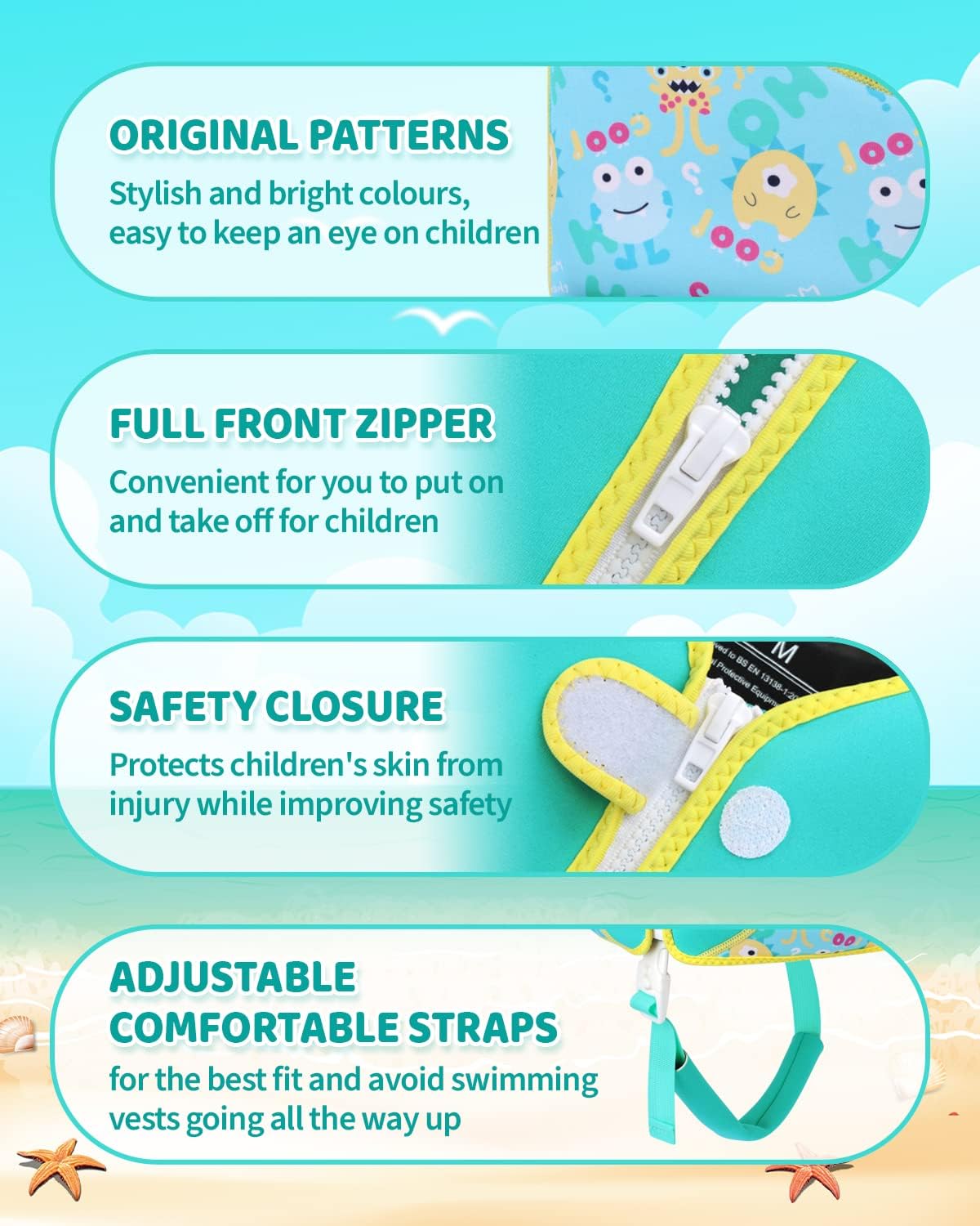 - Jackendesign: Einfach zu schwimmen, wenn sich die Arme Ihres Kindes frei bewegen. Einfach zu tragen. Der Reissverschluss ist durch ein Tuch geschützt. Der Stoff ist bequem und schützt die Haut des Kindes.