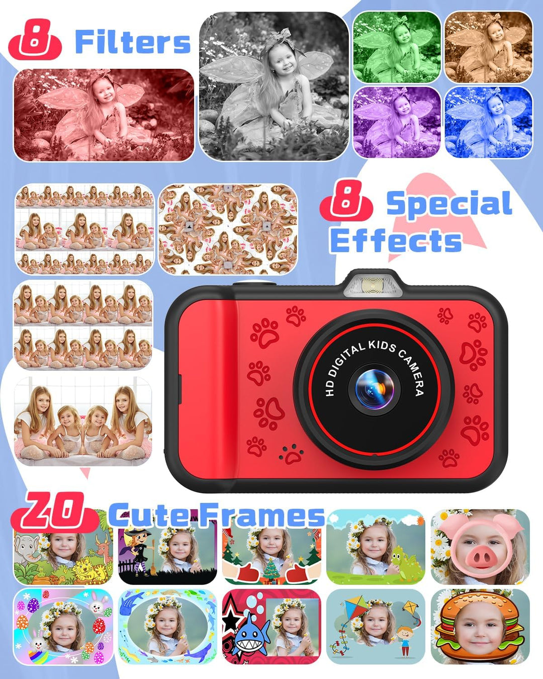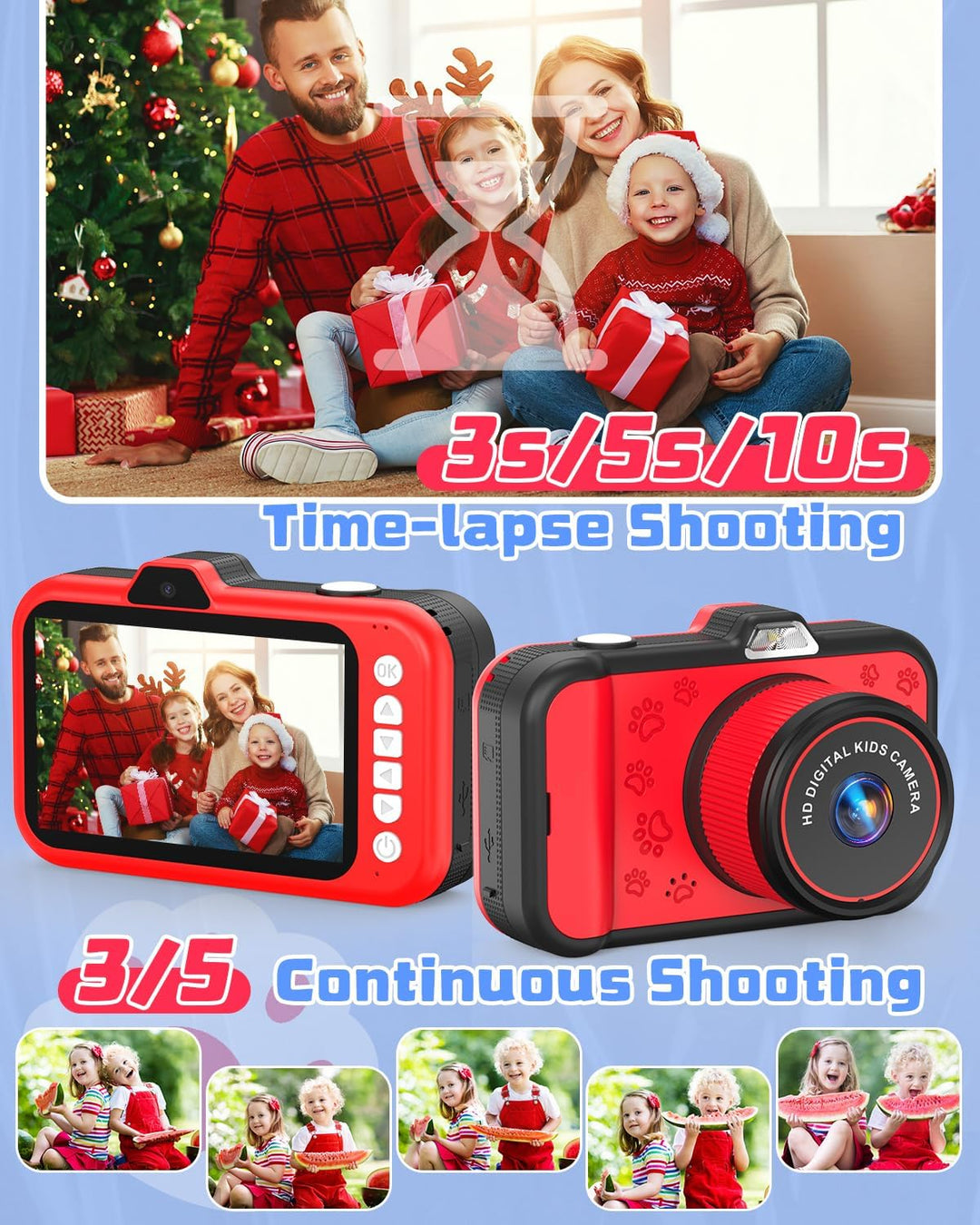 - Multifunktionale Digitalkamera Kinder: Die kamera für kinder verfügt über 48 Megapixel vorne und hinten Dual-Objektiv und 1080P HD-Video, 10-facher Digitalzoom. Es unterstützt Fotoaufnahmen, Videoaufnahmen, Wiedergabe, Wecker, Musik, Serienaufnahmen,