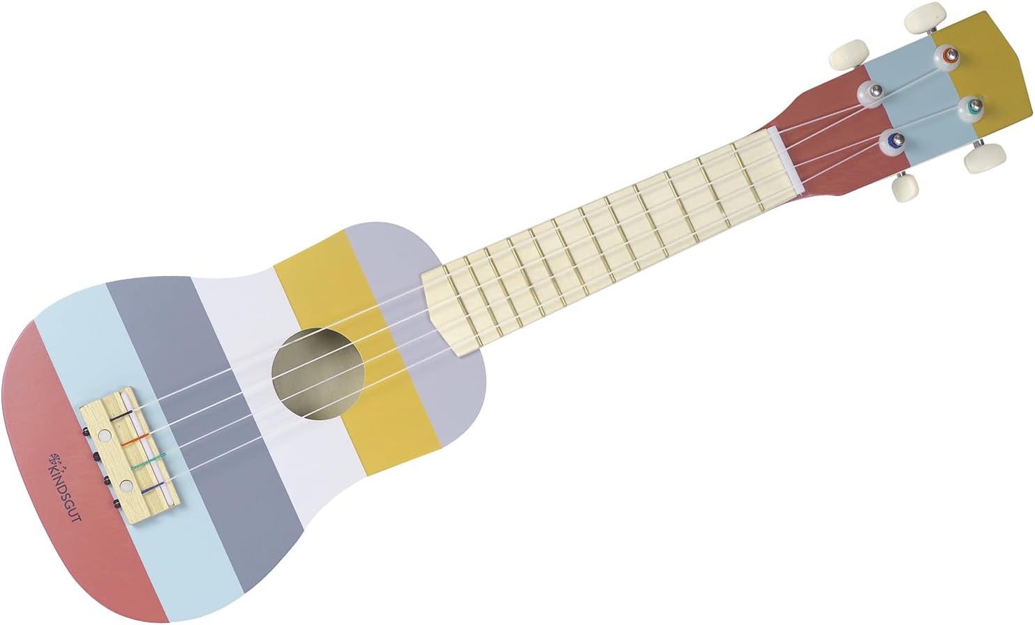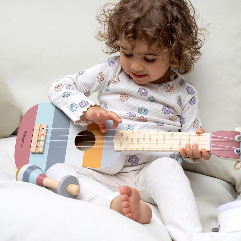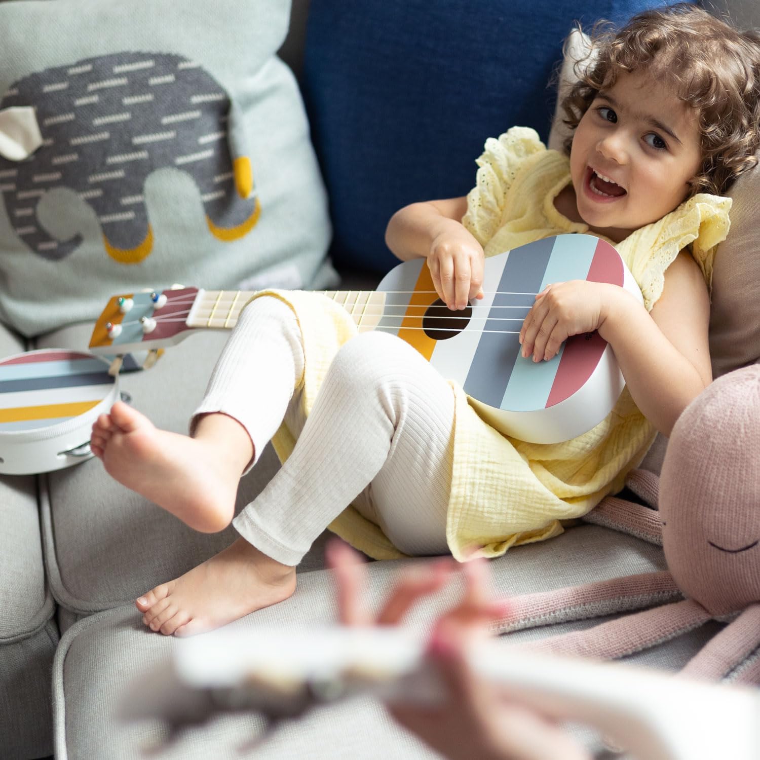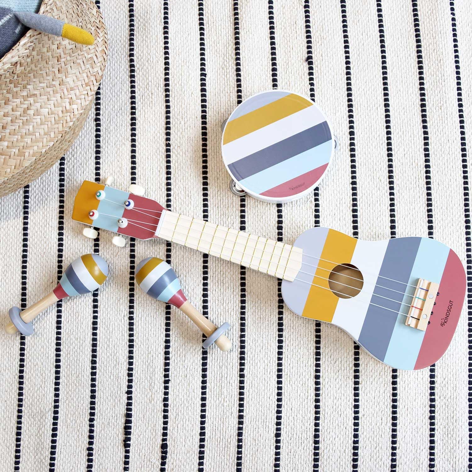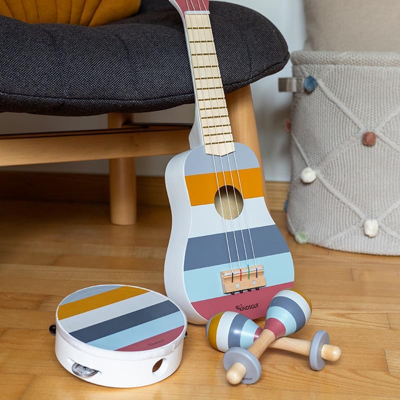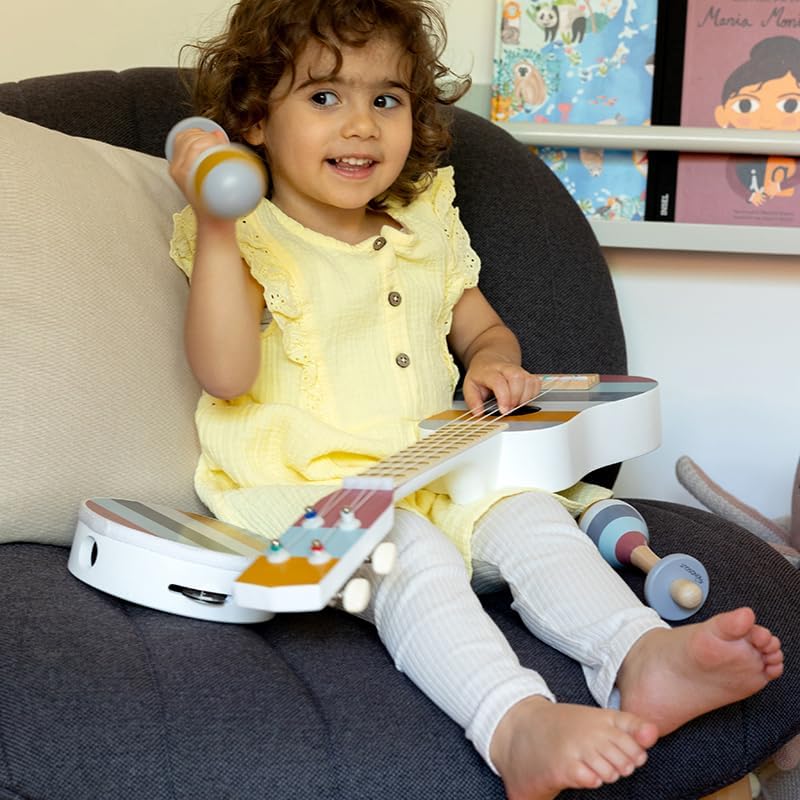 - Enthält eine Kindergitarre mit vier Saiten, zwei Rasseln und ein Tamburin mit Schellen