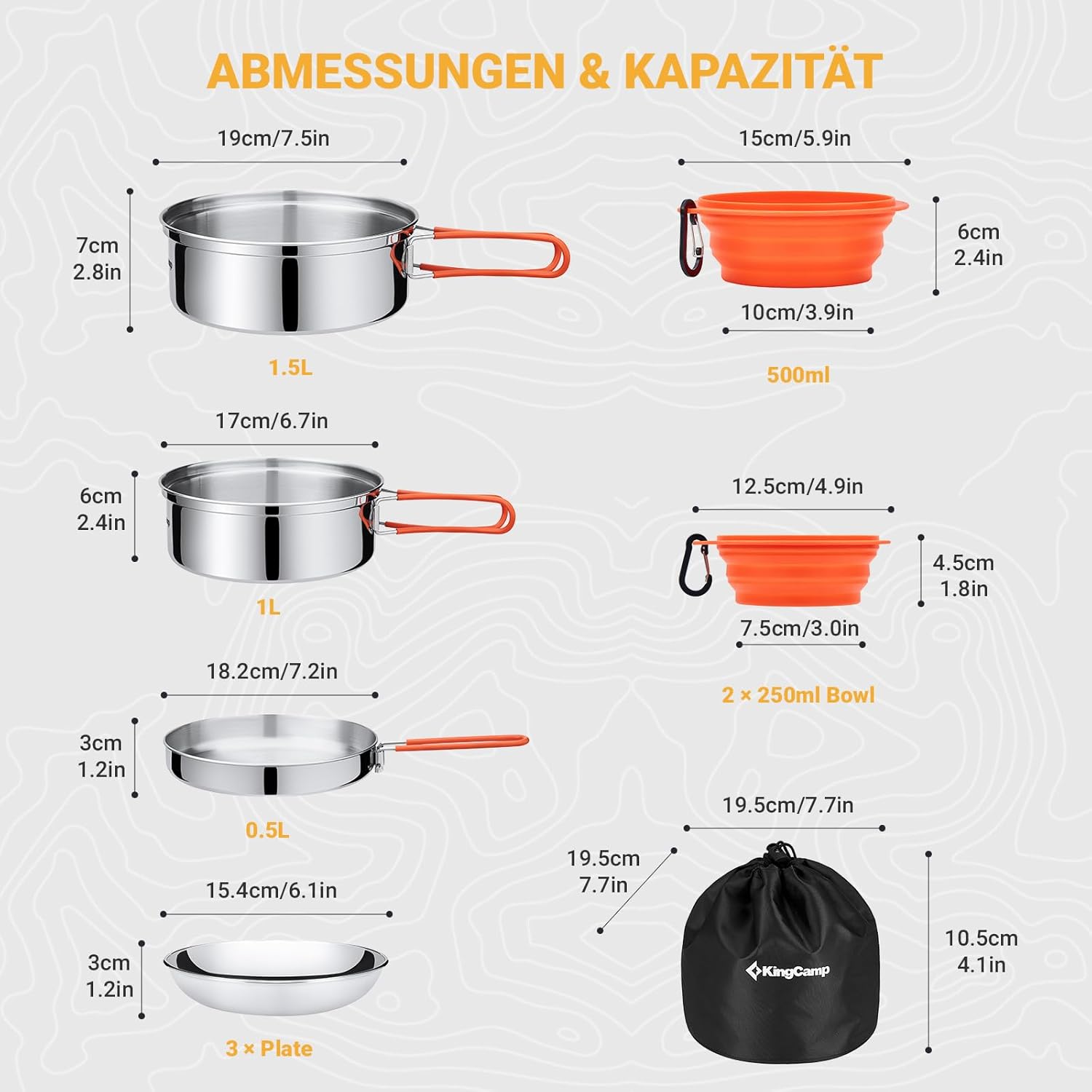 • 25 Teiliges Kochgeschirr-Set für 3 Personen | Set Inhalt: 1 kleiner Edelstahl-Topf, 1 grosser Edelstahl-Topf, 1 Edelstahl-Pfanne, 3 Edelstahl-Teller, 3 faltbare Silikon-Schüsseln mit 3 Karabiner, 3 Edelstahl Löffel-Gabel-Messer Set mit 3 Beutel, 1