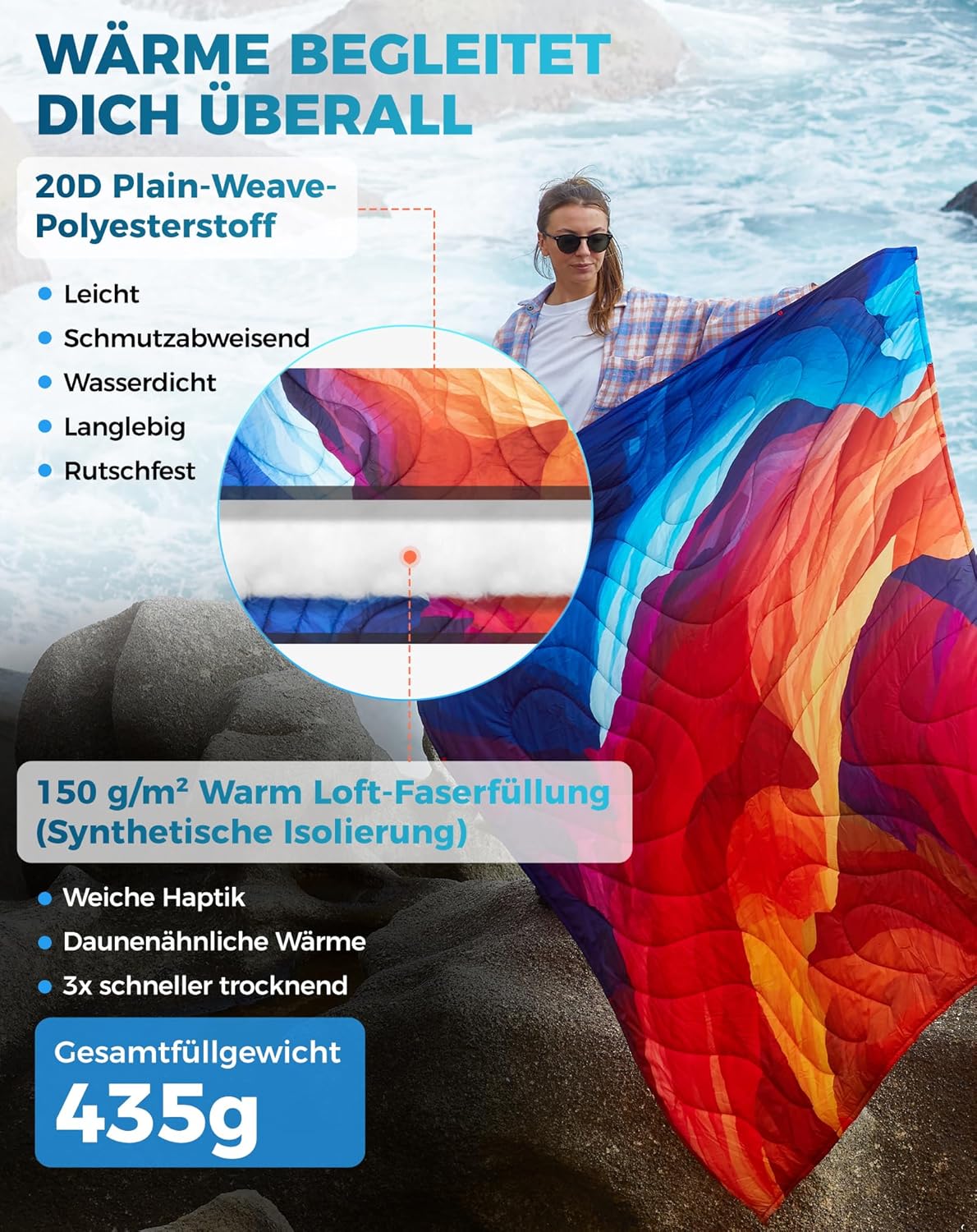 • 【Vielseitig einsetzbare Reisedecke】: Das ist nicht nur eine Camping Decke ,Sie kann auch in eine Umhang oder einen Schlafsack verwandelt werden. Die vier Eckringe sorgen dafür, dass die Reisedecke Ultraleicht bei Bedarf gesichert werden kann. Die