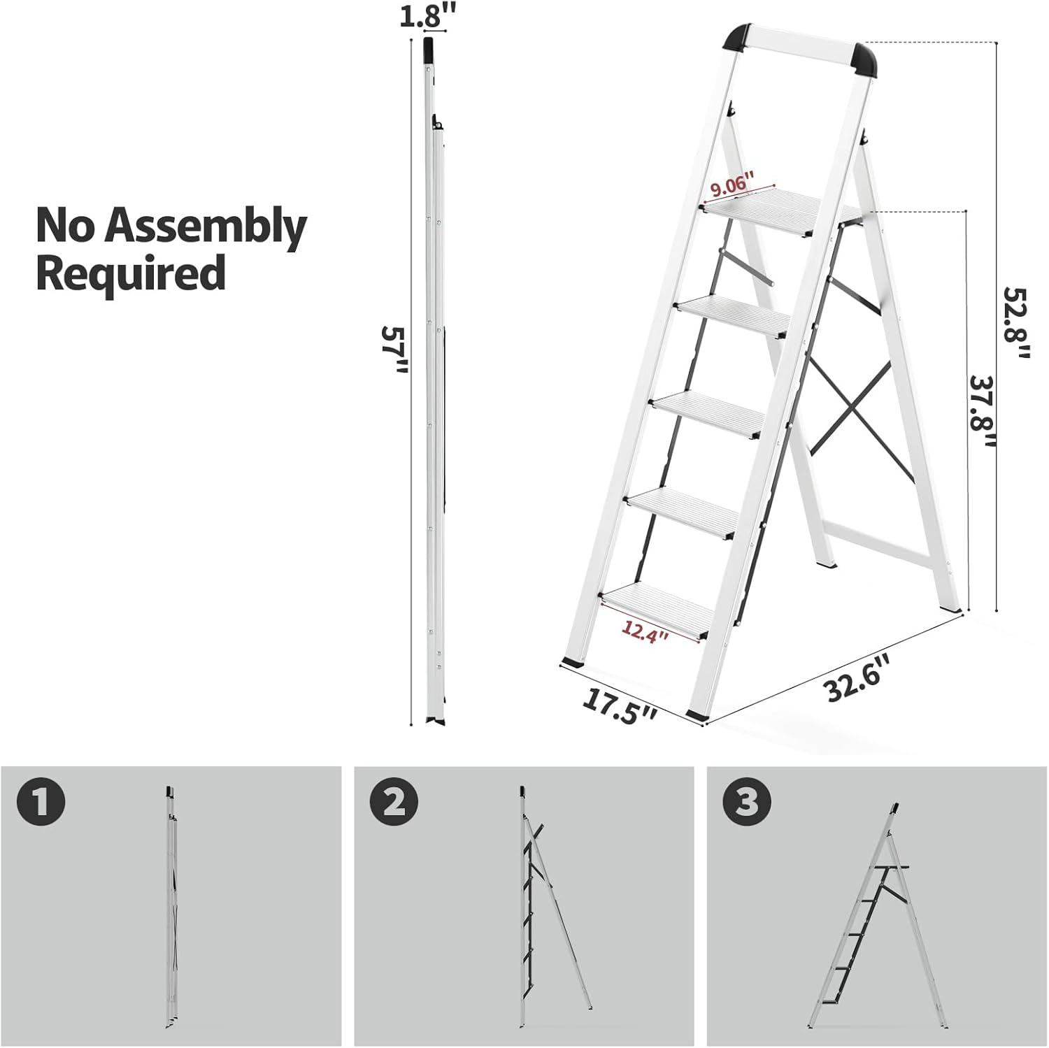 - 【Anti-Rutsch-Design】: Die Pedaloberfläche dieser 5-stufigen Leiter verfügt über ein horizontales Muster, es verläuft senkrecht zur Maserung der Sohlen, und die Fussabdeckung verfügt über eine Vollgummi-Rutschsicherung mit Form gepressten