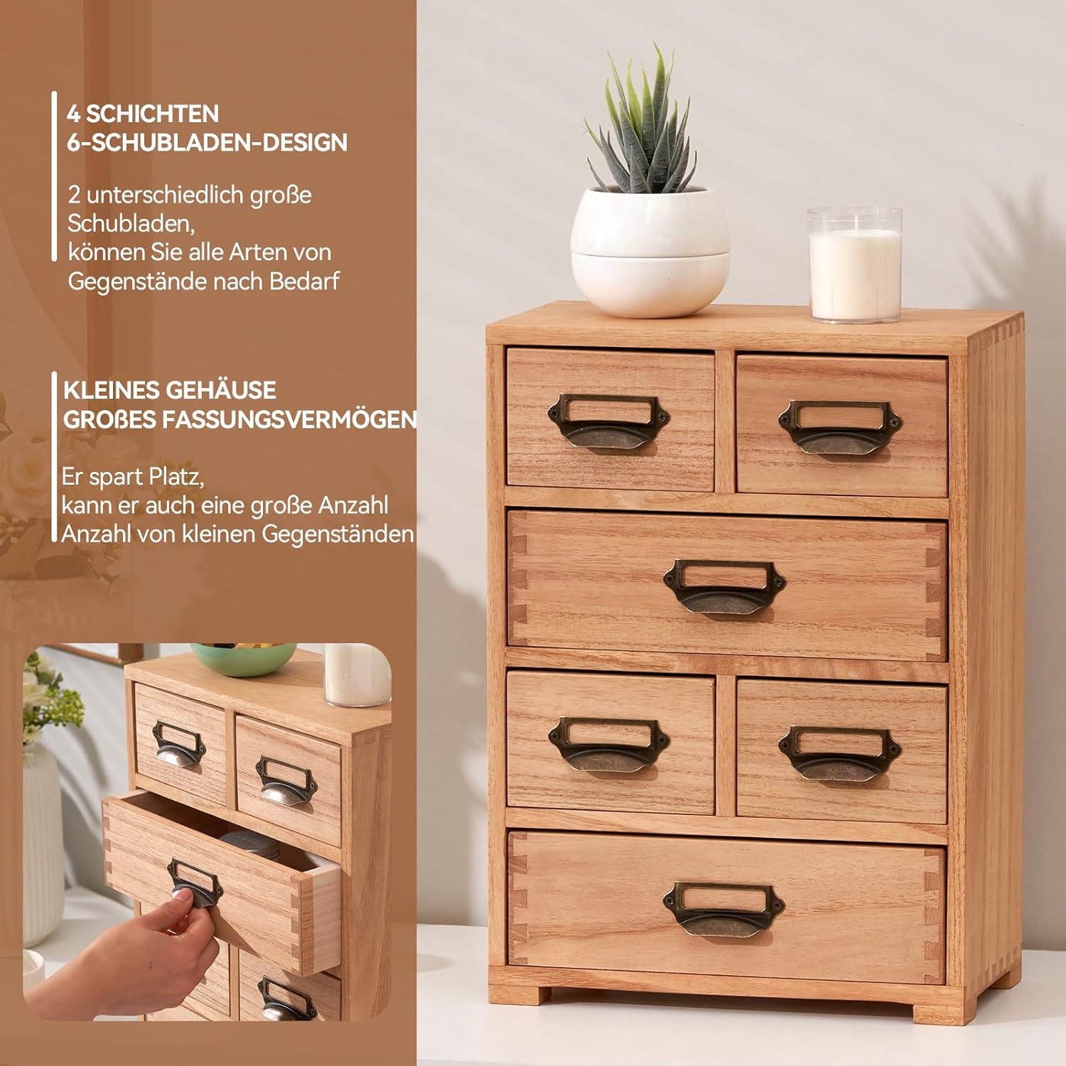 - [CUTE DESIGN] Diese hölzerne Aufbewahrungsschrank kommen mit 6 Mini-Schubladen, und jede Schublade hat einen Metallgriff und Etikettenhalter, die leicht zu öffnen und zu suchen ist.