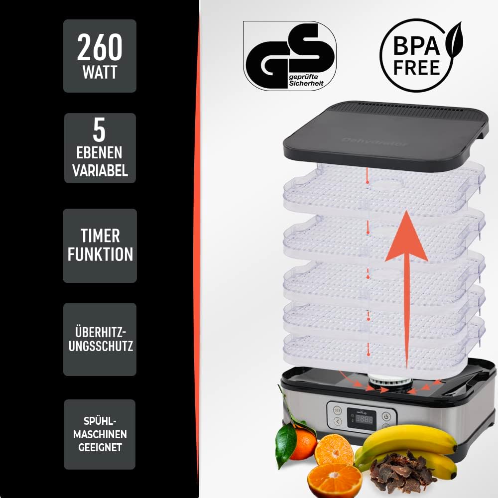- 𝗚𝗘𝗦𝗨𝗡𝗗𝗘 𝗦𝗡𝗔𝗖𝗞𝗦: Erhalten Sie durch das Trocknen von Früchten, Obst, Kräutern, Gemüse oder Fleisch alle wichtigen Vitamine in den Produkten. Schonend dehydrieren ohne Zusatzstoffe.