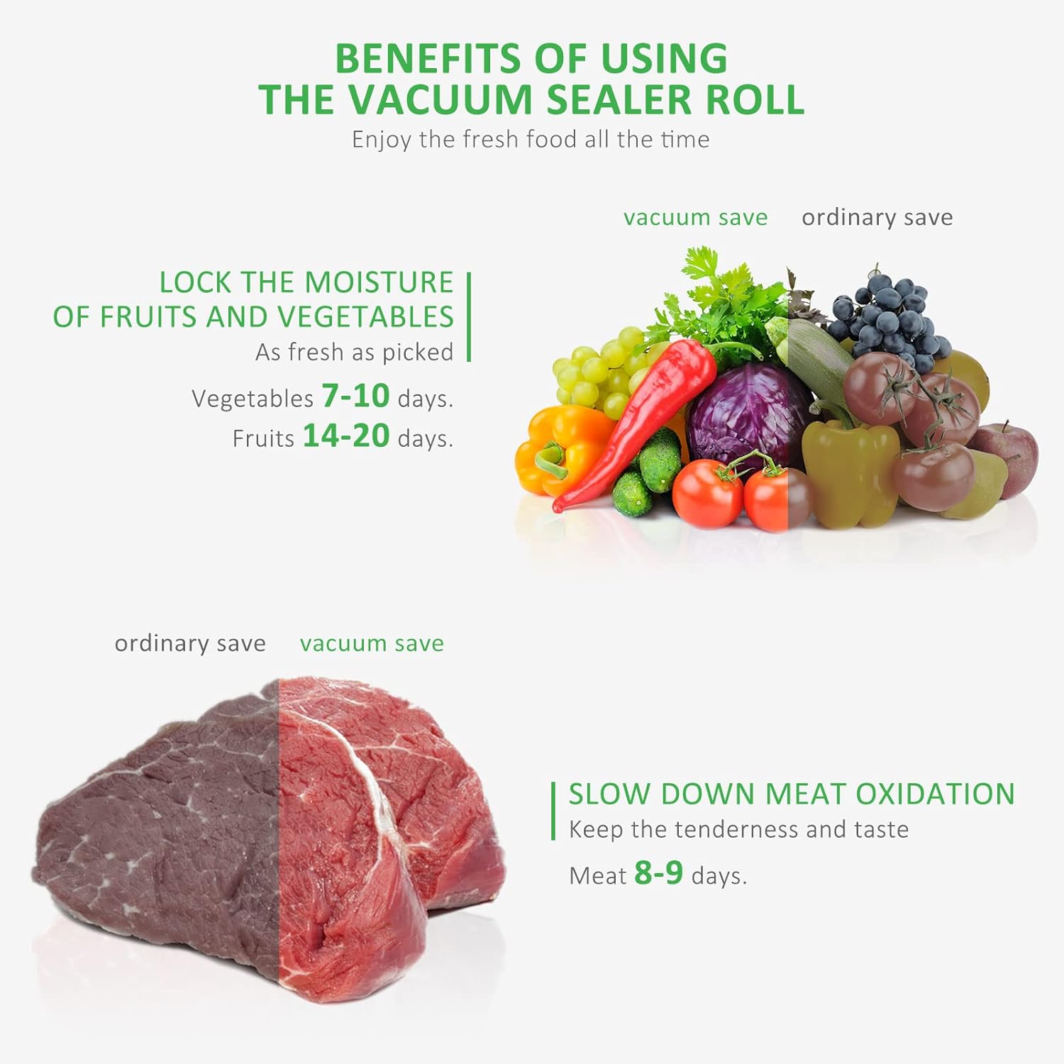 - Kostenloses Zuschneiden ohne Verschwendung: Erhalten Sie mehr Wert für Ihr Geld mit dem 8 Rollen Wert-Set, das 8 vakuumierbeutel rollen für die Lebensmittelaufbewahrung enthält. Diese Rollen kommen in vier verschiedenen Breiten, mit jeweils zwei