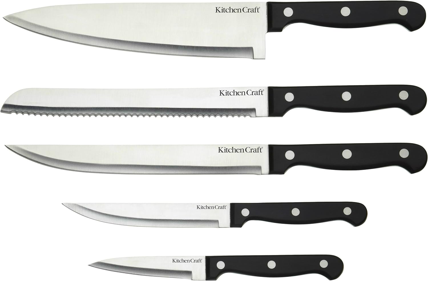 - Das Set enthält ein Kochmesser, Brotmesser, Tranchiermesser, Allzweckmesser und Schälmesser sowie eine Küchenschere