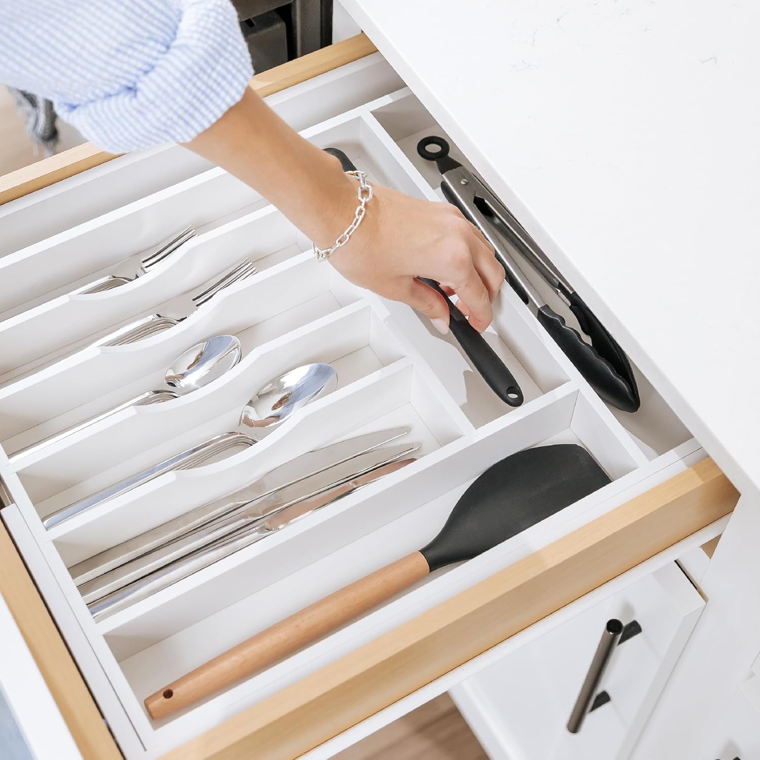 - Maximieren Sie die Speicherkapazität Ihrer Schublade: Dieser weisse Organizer mit 10 Fächern (8 feste + 2 verstellbare) weisse Organizer misst 43,8 cm lang x 6,9 cm hoch und lässt sich von 35,6 cm auf 63,5 cm breit (und jede Breite dazwischen). Die