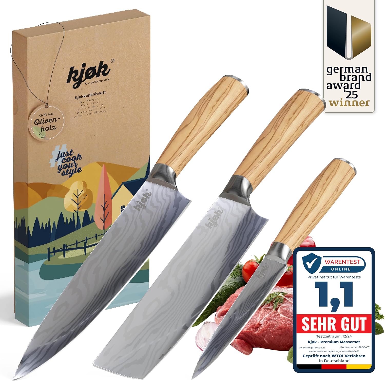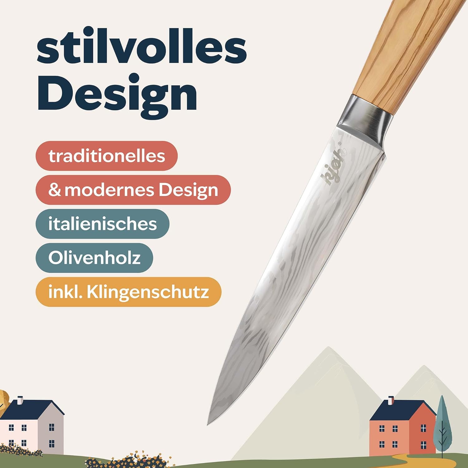 - ✅ ECHTHOLZGRIFFE FÜR KOMFORT - alle Messer sind mit ergonomischen, rutschfesten Echtholzgriffen aus antibakteriellem, hitzebeständigem Olivenholz ausgestattet. Diese hochwertigen Griffe bieten einen sicheren Halt und sind sowohl für Rechts- als auch