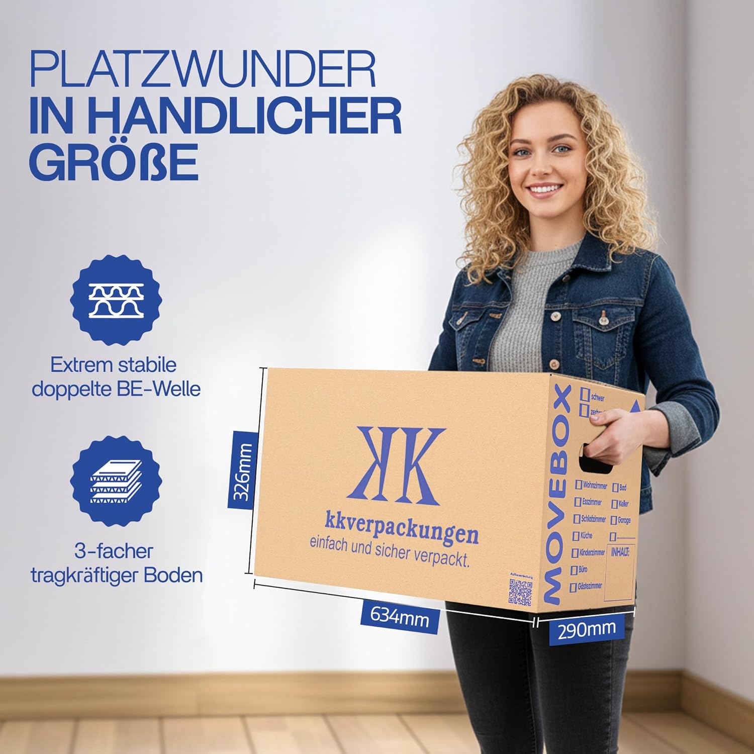 - [SEHR STABIL] ✅: Unser 634 x 290 x 326 mm grosse Movebox Umzugskarton ist aussergewöhnlich stabil. Mit seiner robusten Grammatur, der stabilen doppelten B-Welle und dem soliden 3-fachen Schmetterlingsboden bewältigt der Umzugshelfer mühelos Lasten