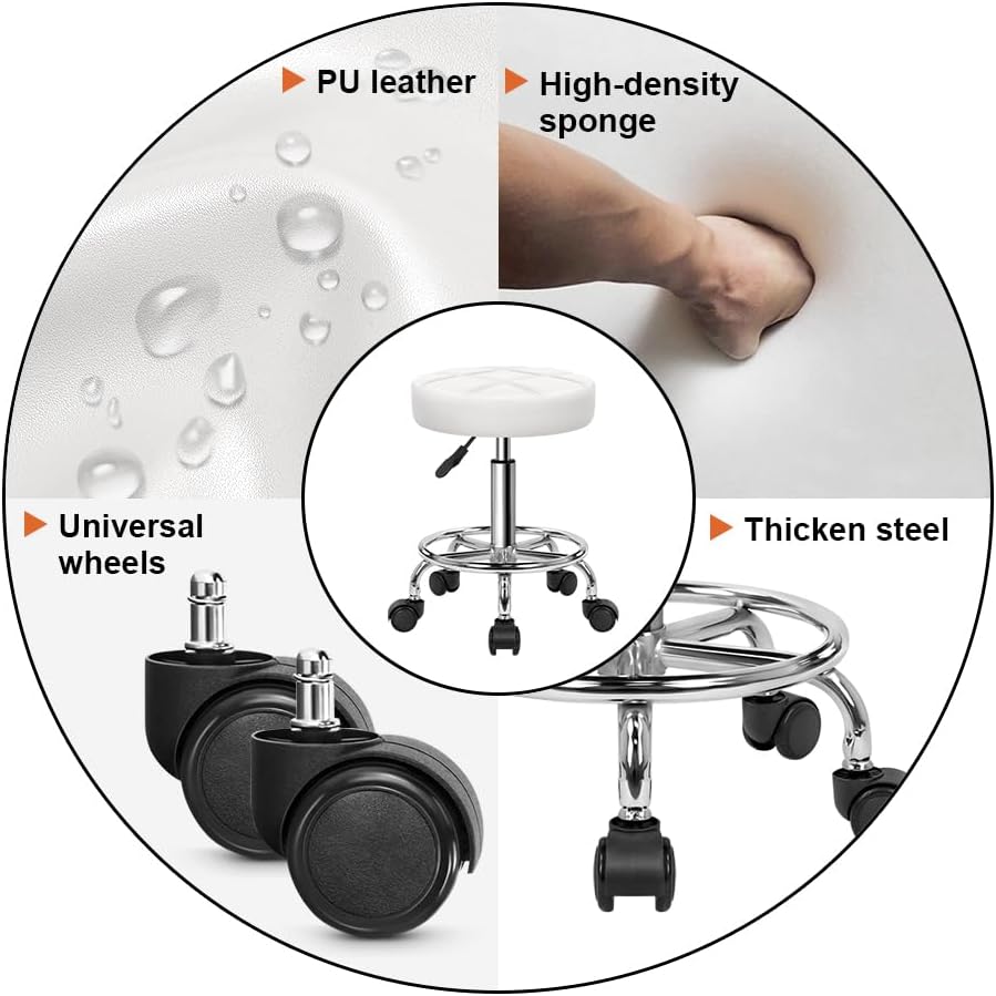 - BEQUEM UND BEWEGLICH: Mit 5 leichtgängigen Rollen ist dieser Rollhocker sehr leicht zu bewegen. 8cm dicker Sitz und Fussstütze bieten Ihnen zusätzlichen Komfort. Max. Belastbarkeit : bis zu 110kg.