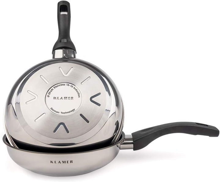 - HÖCHSTE QUALITÄT: Extra harter Edelstahl aussen und eine Keramik verstärkte PTFE Versiegelung innen machen die Bratpfanne zu einem äusserst robusten Begleiter in der Küche mit einer langen Lebensdauer. Darüber hinaus sind KLAMER Pfannen PFOA frei