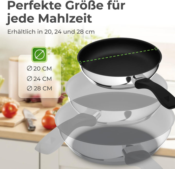 - UNIVERSALPFANNE: Die Edelstahl-Pfanne kann auf allen Herdarten verwendet werden. Eine Wandstärke von 0,8 mm, sowie ein Aluminiumkern im Boden verleihen der Induktionspfanne optimale Wärmeleiteigenschaften und Hitzespeicherung