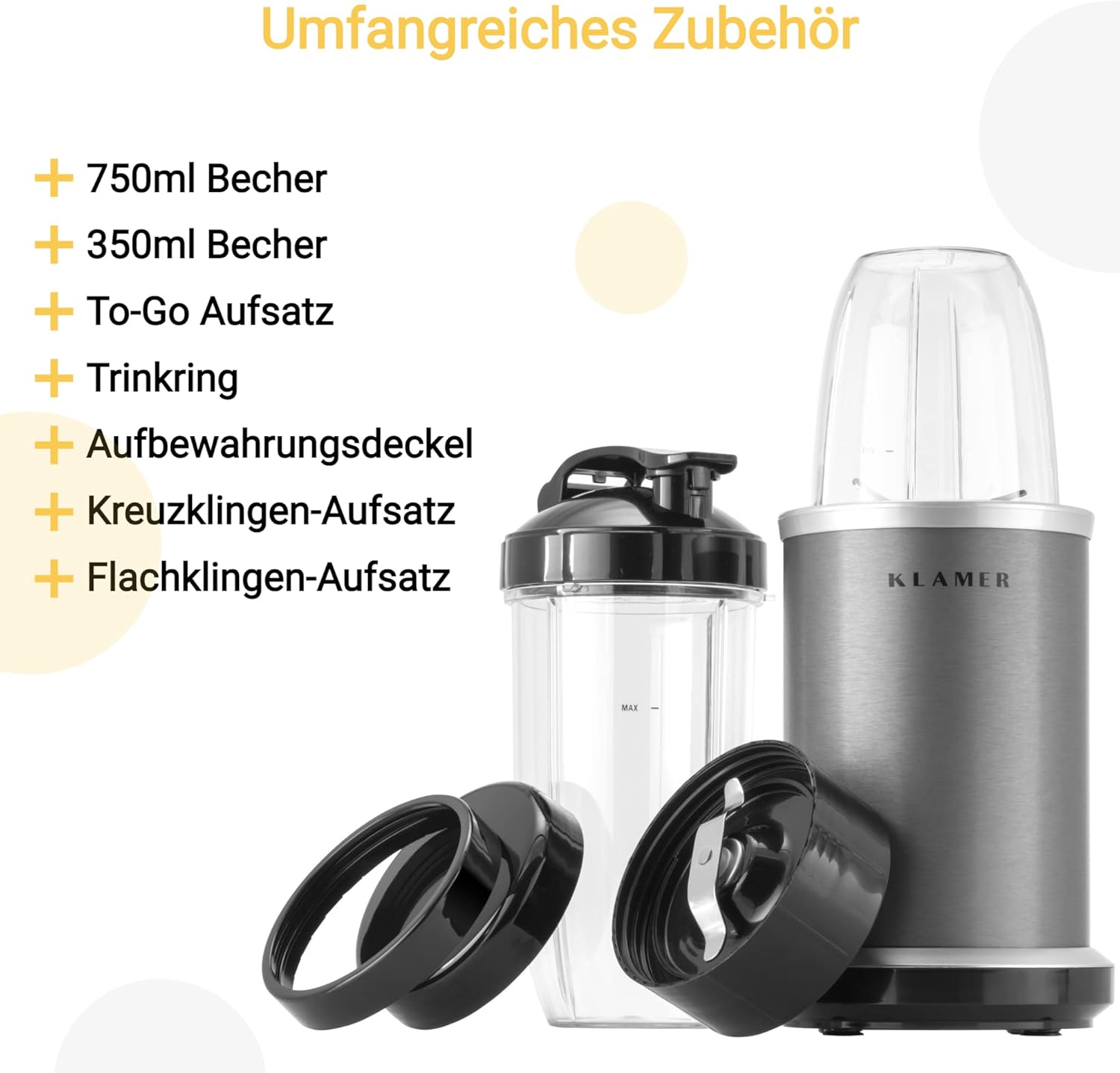 - PRAKTISCH: Die 700ml & 350ml fassenden Mixbehälter können nach dem Mixen direkt mit dem Deckel- oder dem Klappverschluss verschlossen werden. Der Mixbehälter sowie die Zubehörteile des Smoothie Maker sind aus BPA-freien Material und spülmaschinenfest