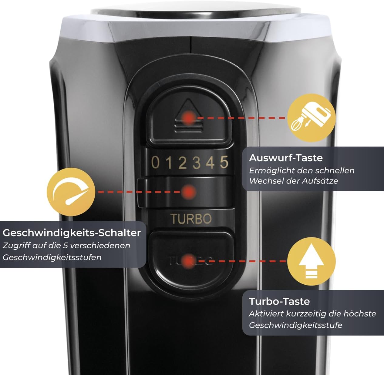 - TURBO-FUNKTION: Durch kurzzeitiges Drücken der Turbo-Taste wird die Beschleunigungs-Funktion des Handrührgeräts aktiviert. Mit dem 600 Watt starken Motor lassen sich damit Cremes schnell schaumig schlagen, Teigrezepte richtig verrühren und Hefeteig