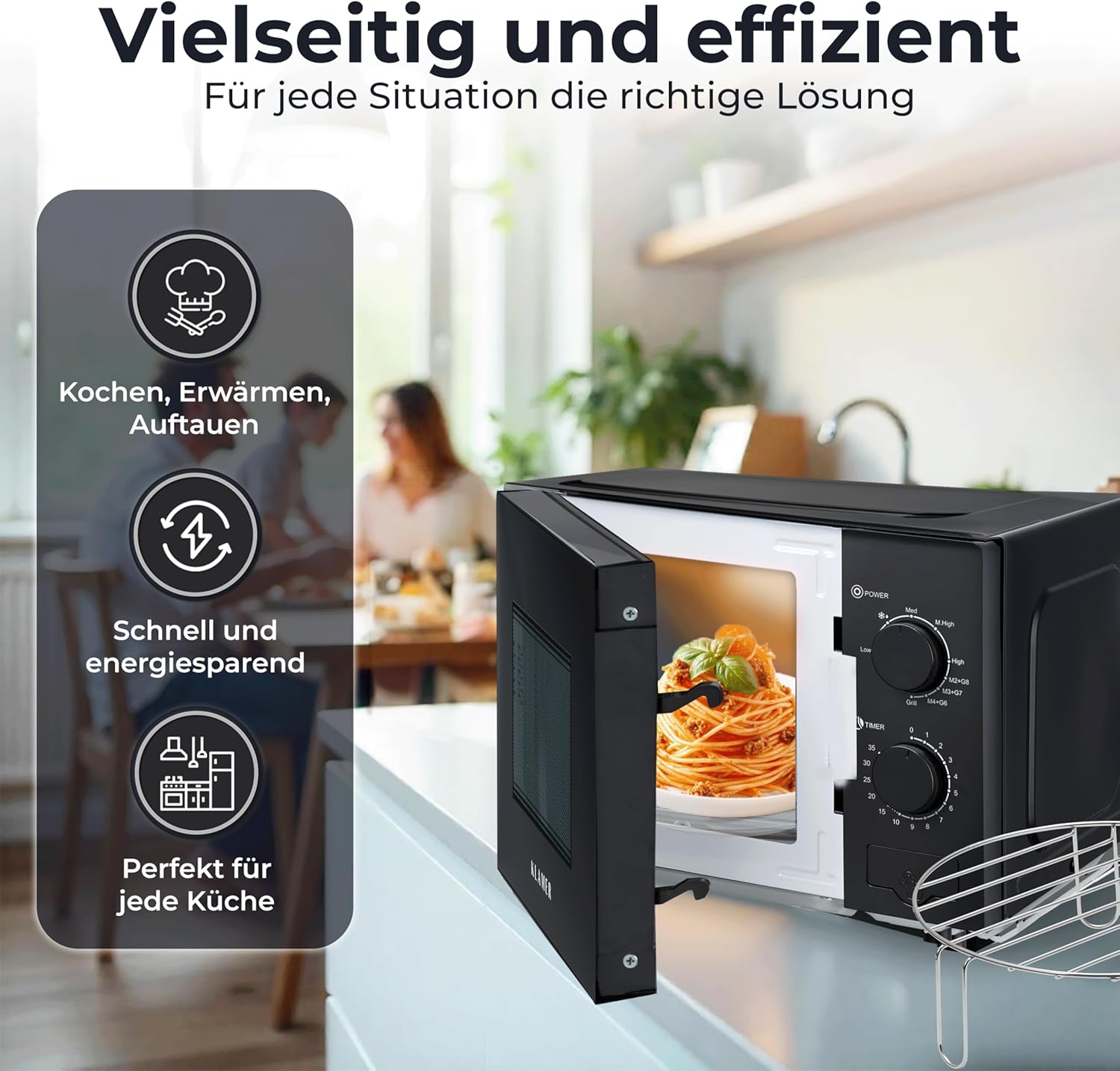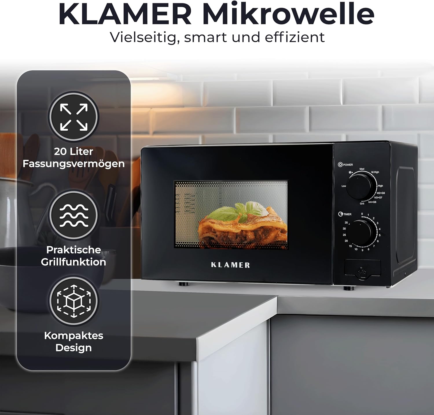 - VIELSEITIG: 20 Liter Fassungsvermögen, 700 Watt Leistung und die Kombination aus Mikrowellen- und Grillfunktion machen die KLAMER Mikrowelle perfekt für schnelle und knusprige Gerichte – von heissen Snacks bis zu goldbraunen Grillgerichten