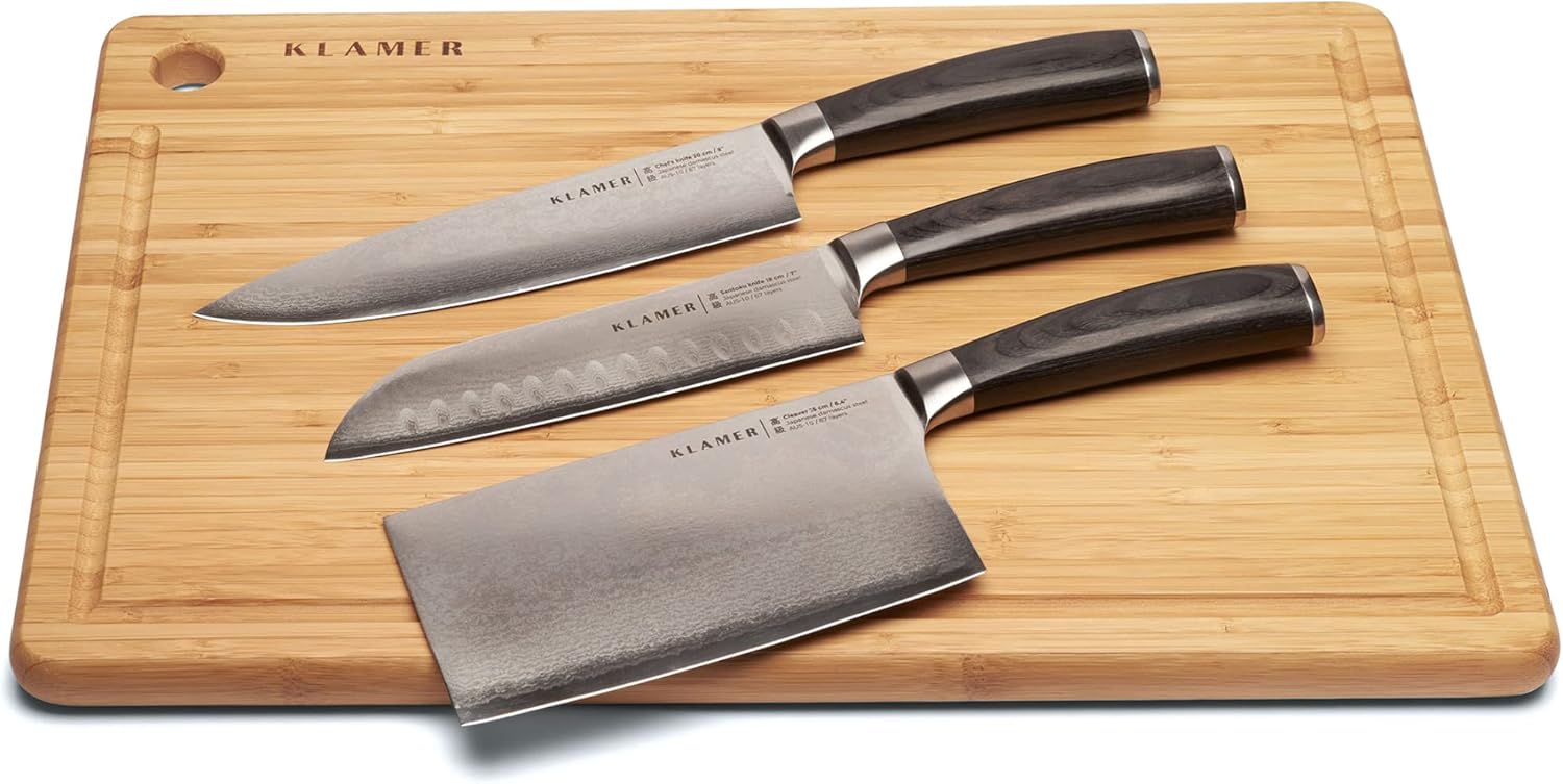 - ULTRASCHARF: Mit einem Schnittwinkel von 13 Grad ist die Klinge der Damastmesser rasierklingenscharf und schneiden präzise alle Arten von Lebensmitteln. Nach mehrfachem Gebrauch immer noch in Topform bestechen die Kochmesser mit ihrer optimalen Schärfe