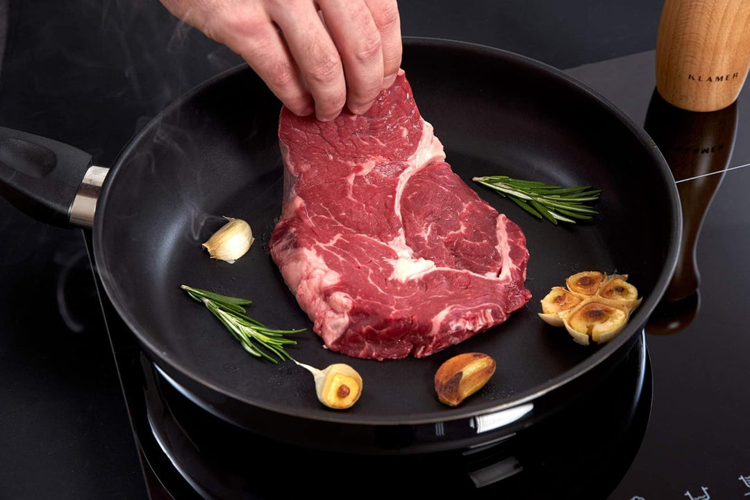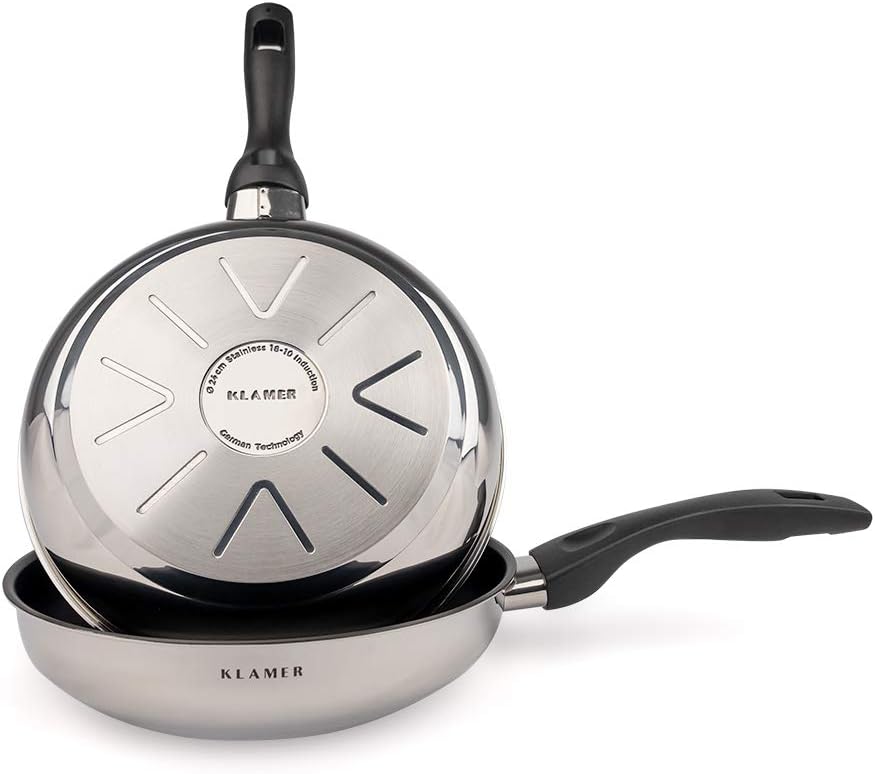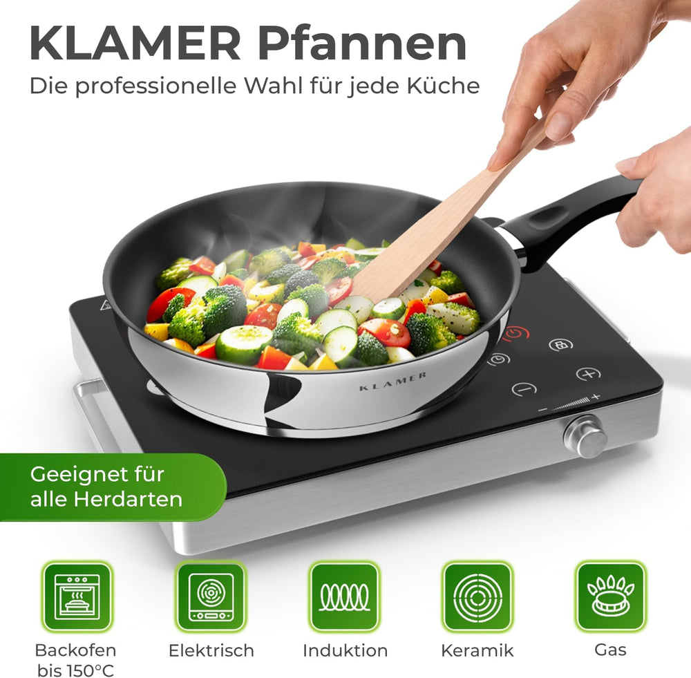 - HÖCHSTE QUALITÄT: Extra harter Edelstahl aussen und eine Keramik verstärkte PTFE Versiegelung innen machen die Bratpfanne zu einem äusserst robusten Begleiter in der Küche mit einer langen Lebensdauer. Darüber hinaus sind KLAMER Pfannen PFOA frei