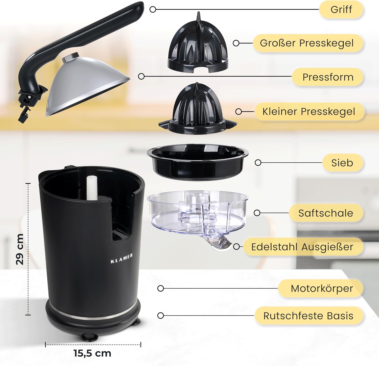 - VIELSEITIG: Die elektrische Saftpresse verfügt über zwei unterschiedlich grosse Presskegel, die sich ideal als Zitronenpresse für kleine Früchte oder als Orangenpresse für grössere Früchte eignen und Früchte restlos auspressen