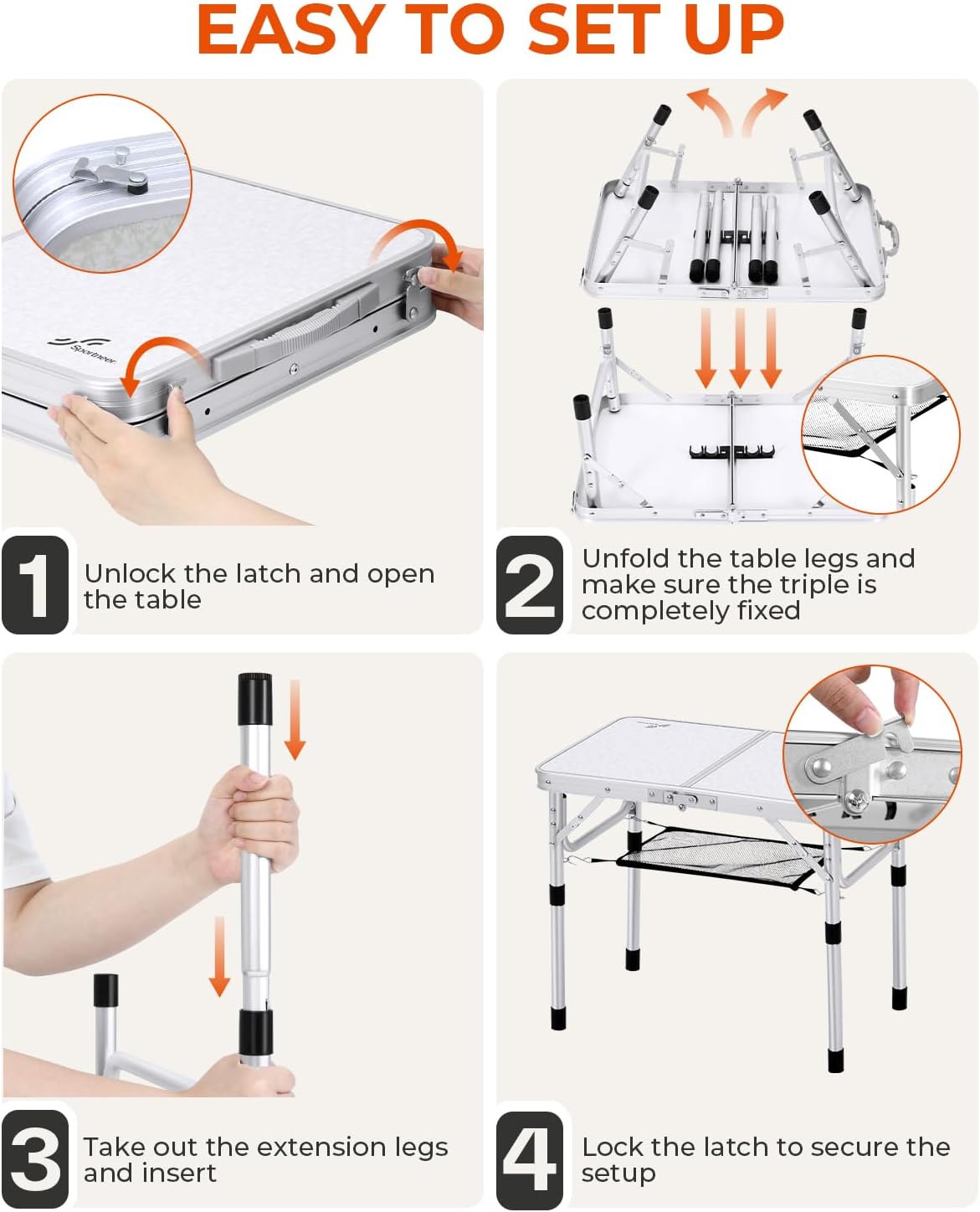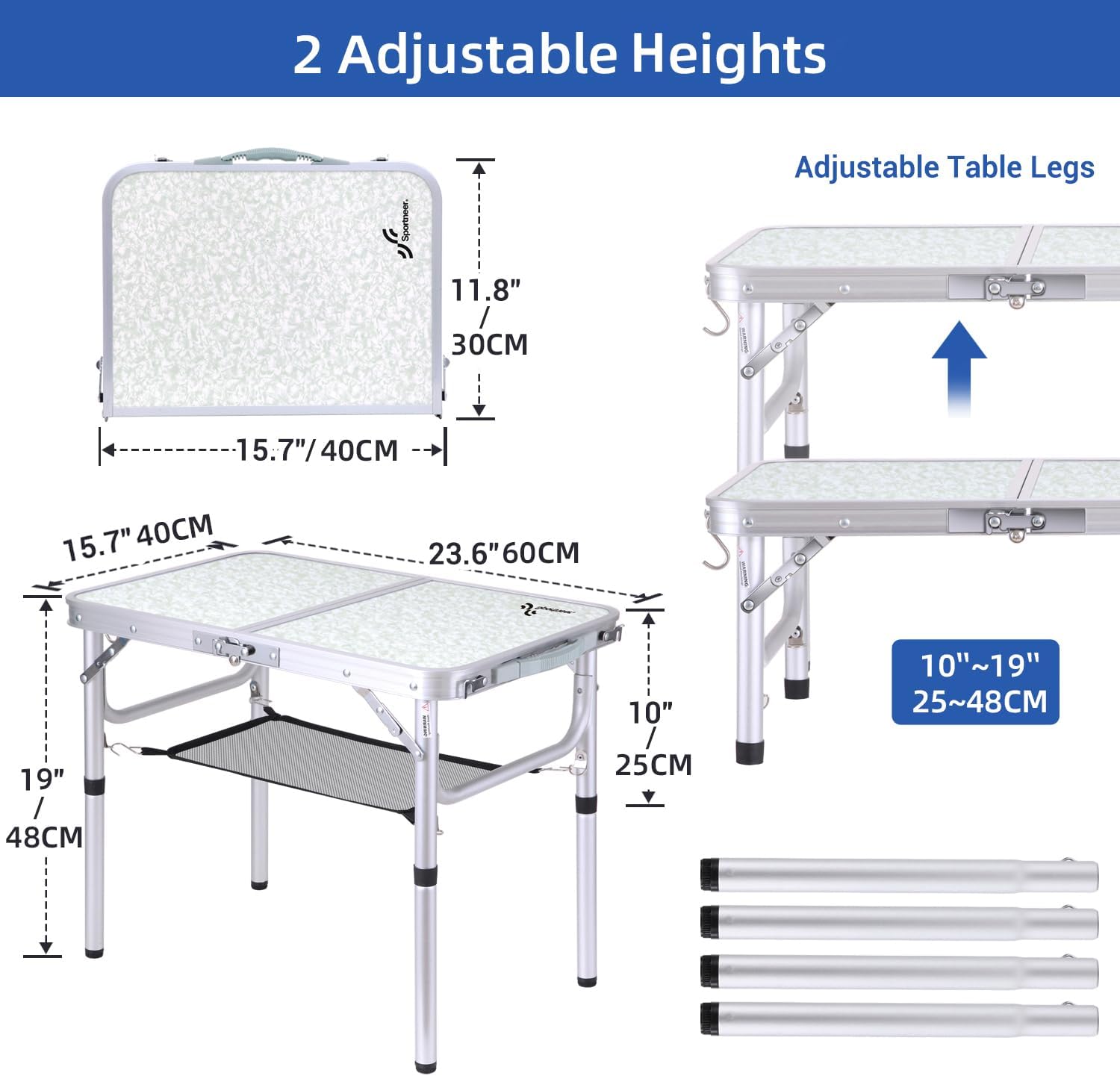 - Die höhenverstellbaren Bockbeine der klappbaren Campingtische von Sportneer sind bei Outdoor-Events und Campingausflügen ein Lebensretter. Es war schon immer schwierig, eine ebene Fläche zum Aufstellen eines Klapptisches zu finden, aber jetzt müssen