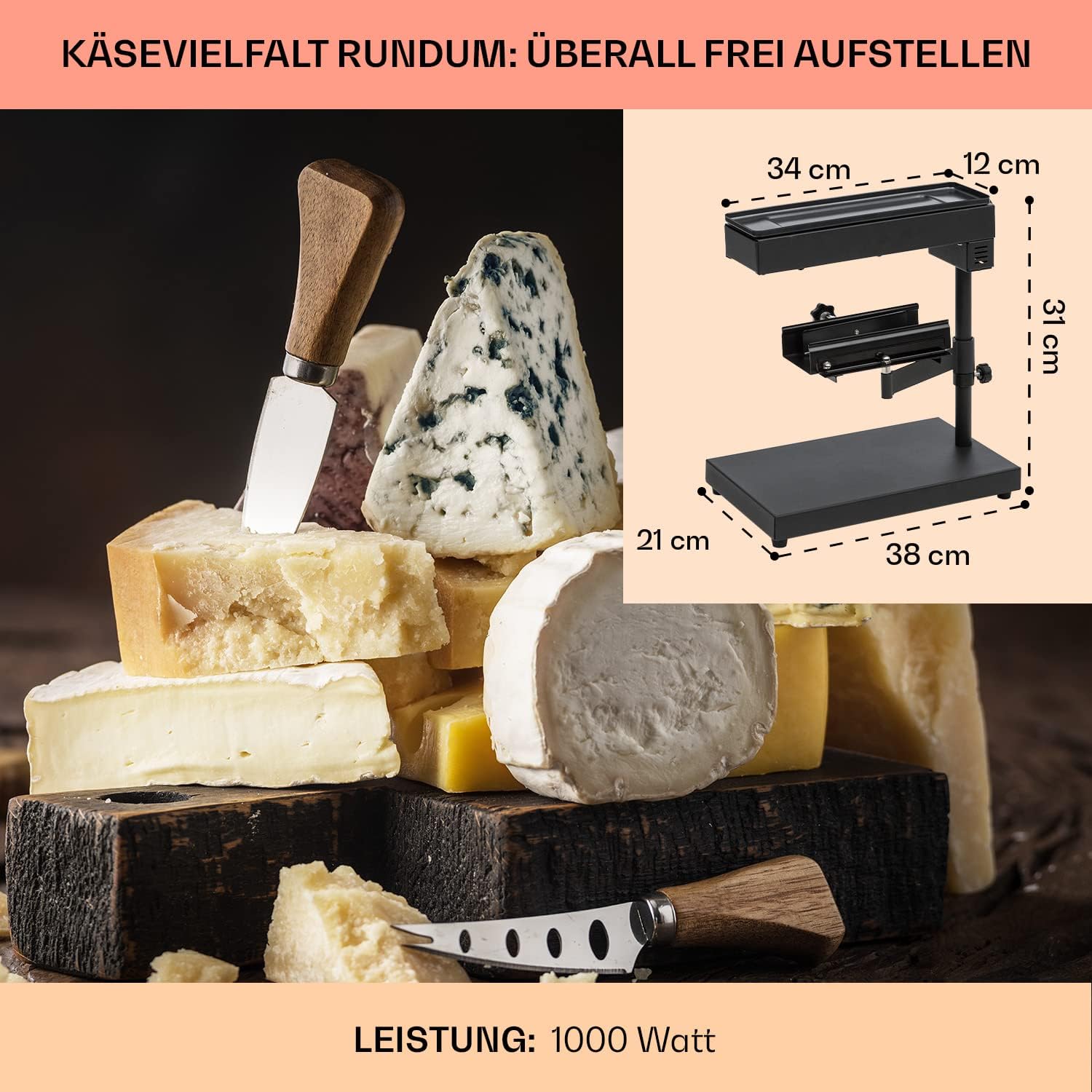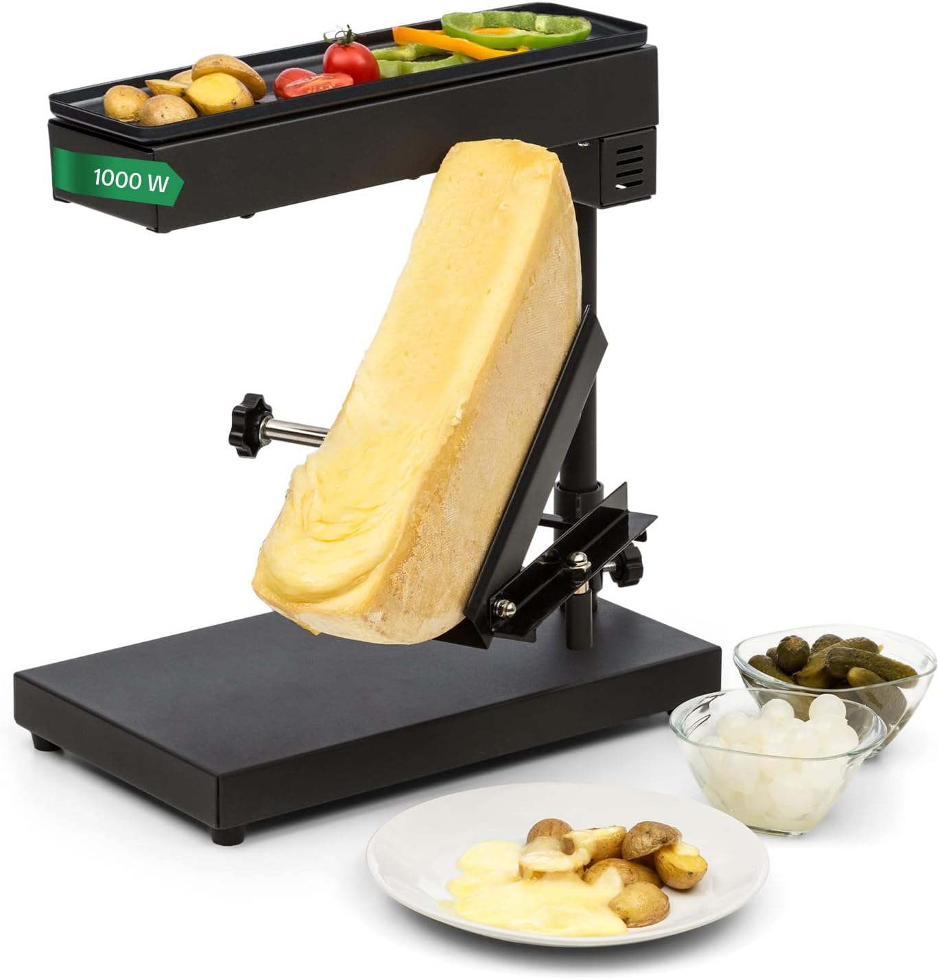 - STARKE LEISTUNG: So geniesst man Raclette auf traditionelle Art: Edel gereifter Käse, vom Block geschmolzen und auf Baguette oder Fleisch verteilt. Dazu wird der Käse direkt im Käseträger eingespannt und unter dem 1000 Watt starken Heizelement positioniert.