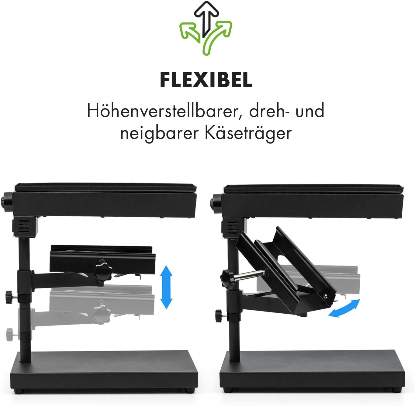 - VERSTELLBAR: Per Höhenverstellung bestimmt man unkompliziert, wie schnell der Käse eine cremige Konsistenz erlangt. Der Käseträger lässt sich zudem seitlich schwenken sowie horizontal kippen, um den Käse ganz einfach auf dem jeweiligen Teller zu verteilen.
