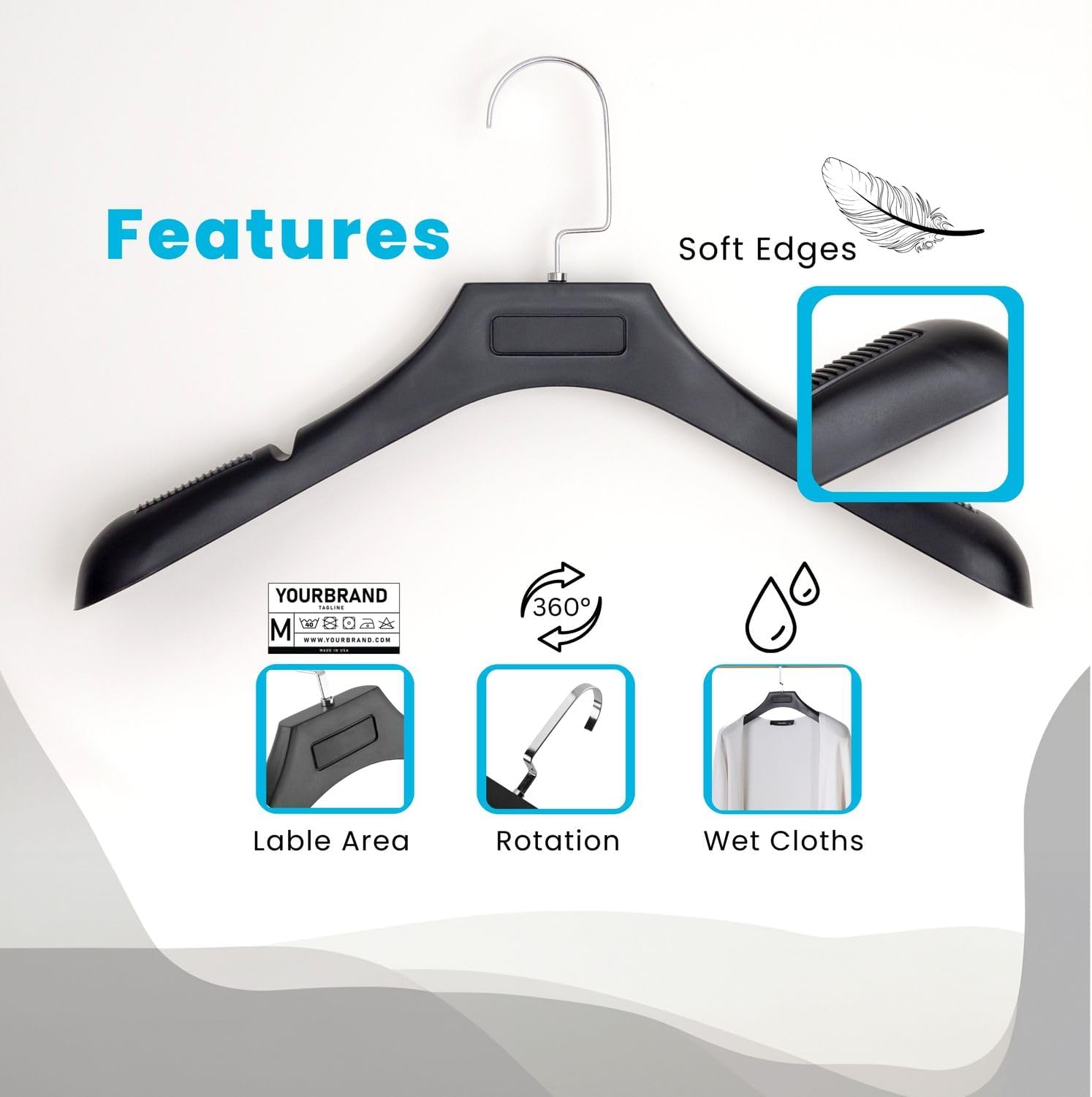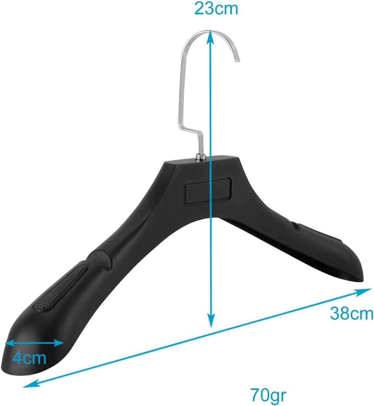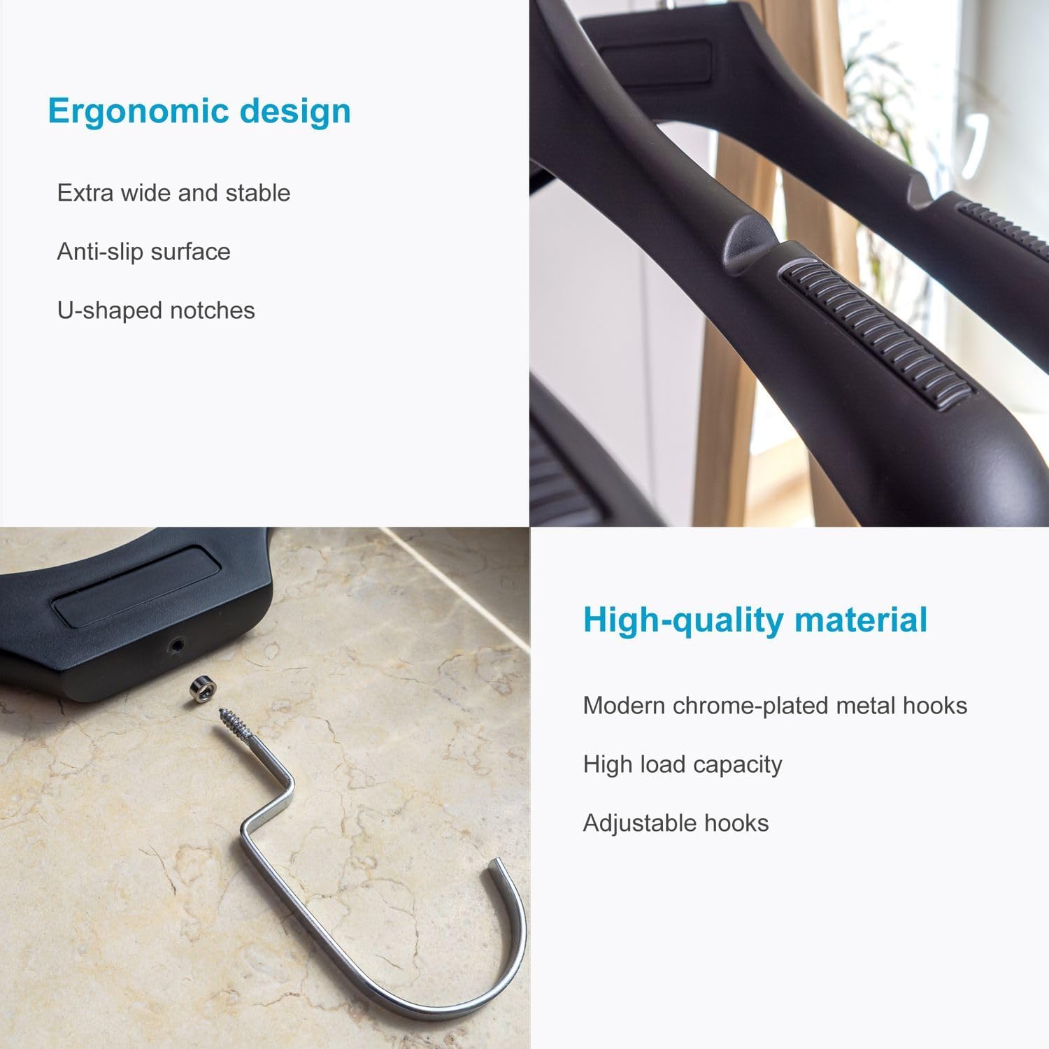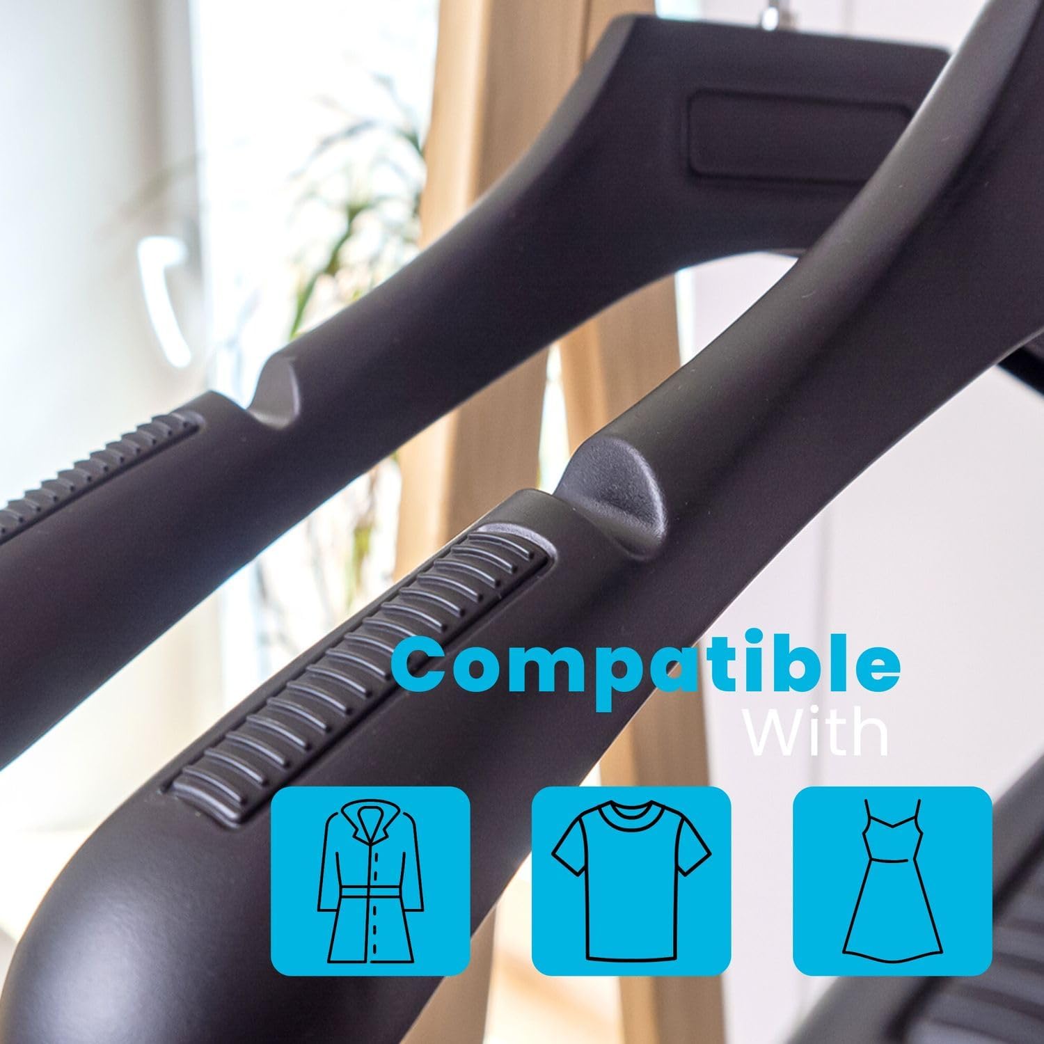 - 20 Ergonomisch geformte, extra breite Kleiderbügel aus hochwertigem Kunststoff und verchromten Metallhaken in matt schwarz. Sie sind leicht, platzsparend und halten Kleidung in Topform.