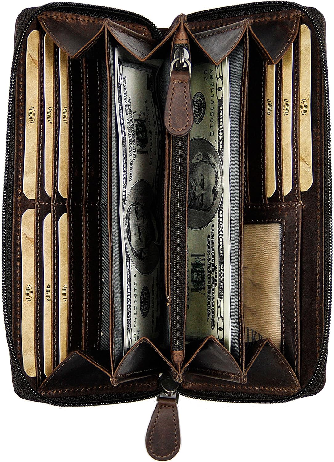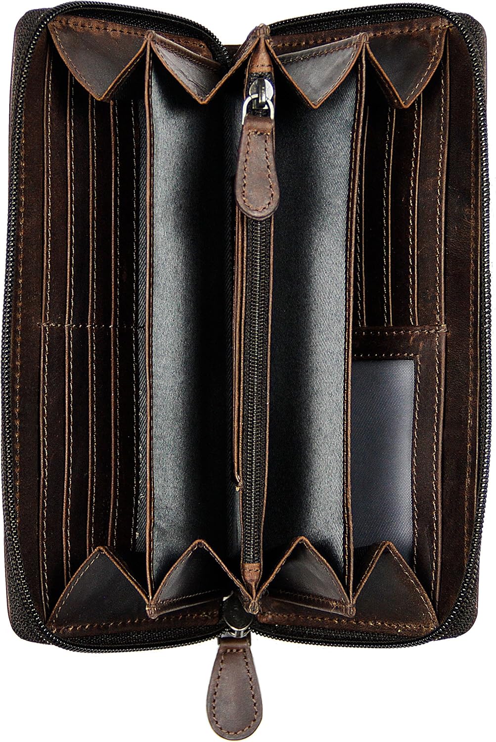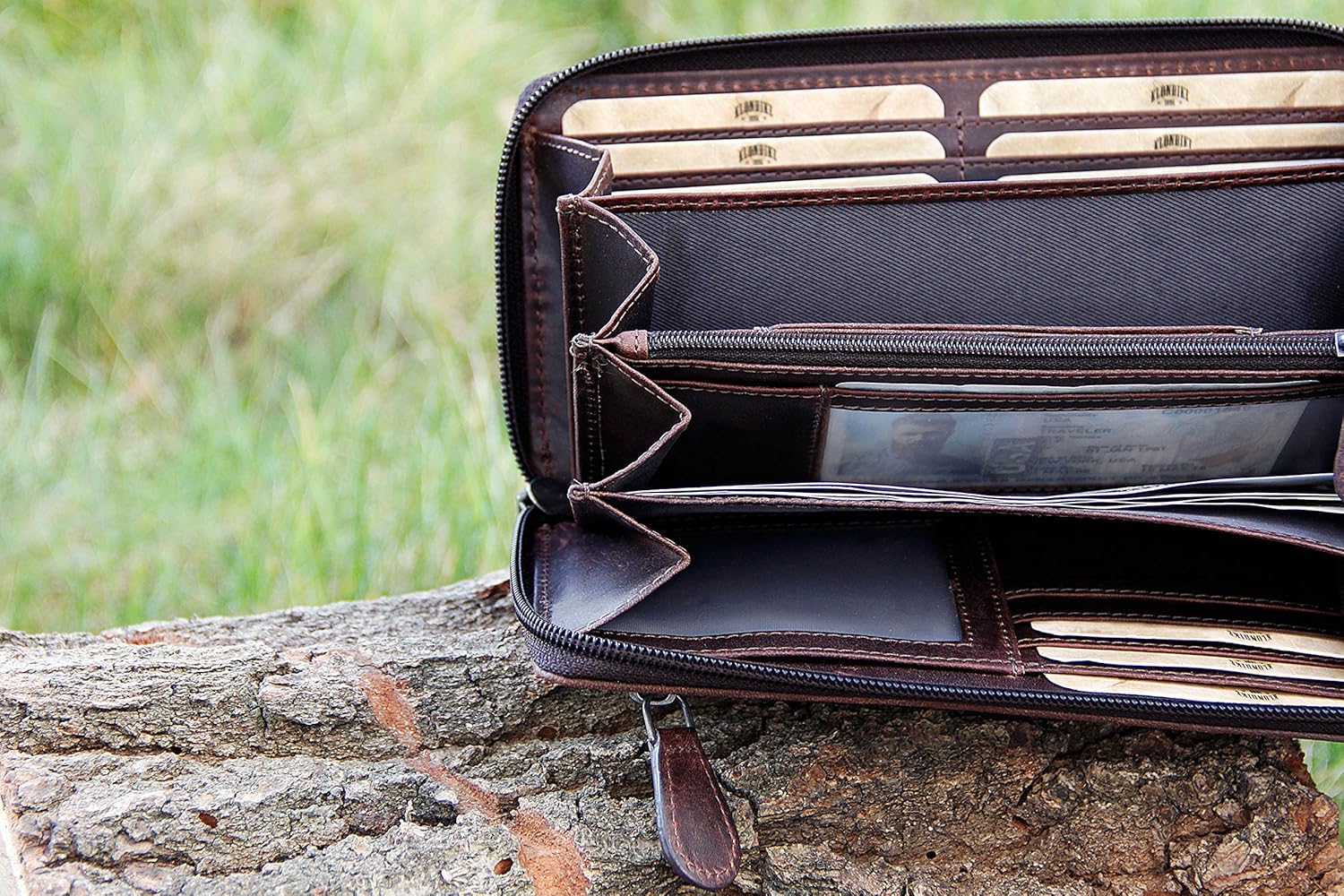 - VIEL PLATZ: Die Brieftasche aus echtem Leder bietet mit 16 Steckfächern, 4 Scheinfächern und einem grossen Münzgeldfach mit extra Reissverschluss eine Menge Platz. Auf der Aussenseite befindet sich ein zweites Reissverschlussfach. Masse der