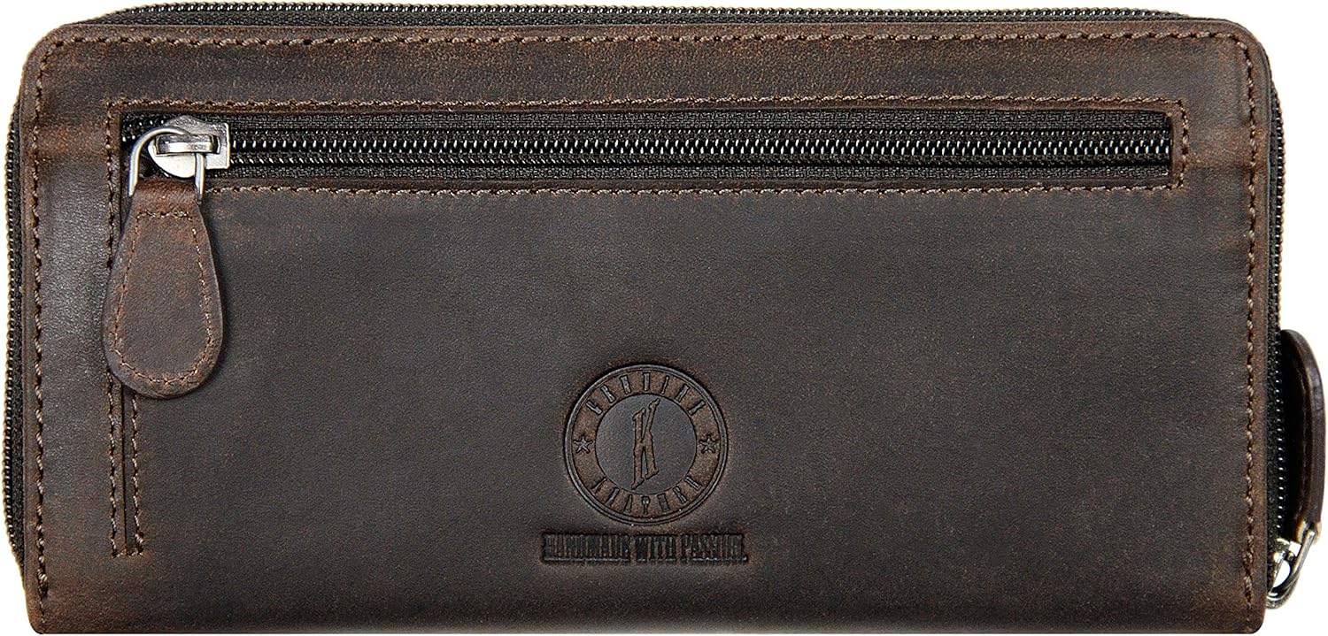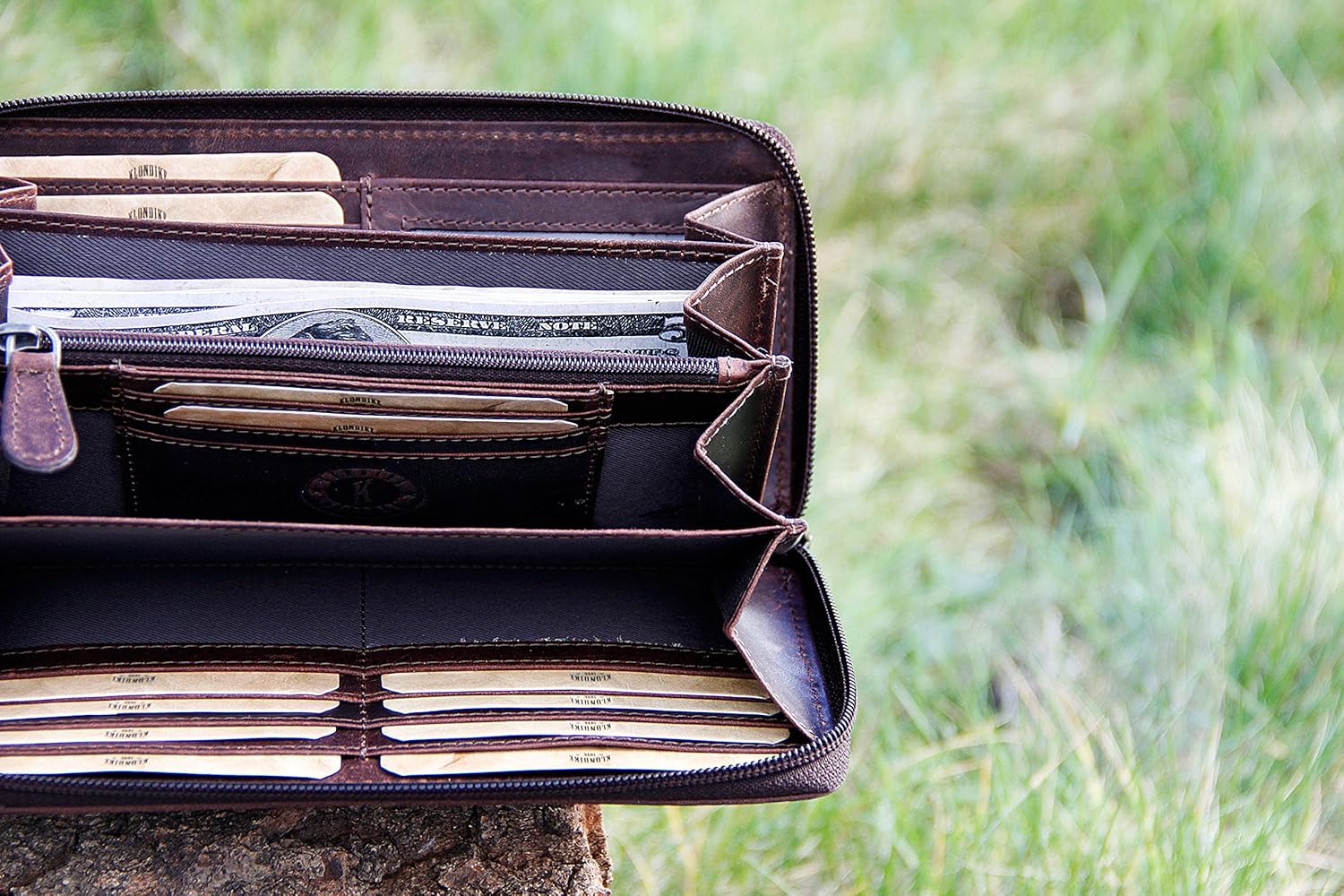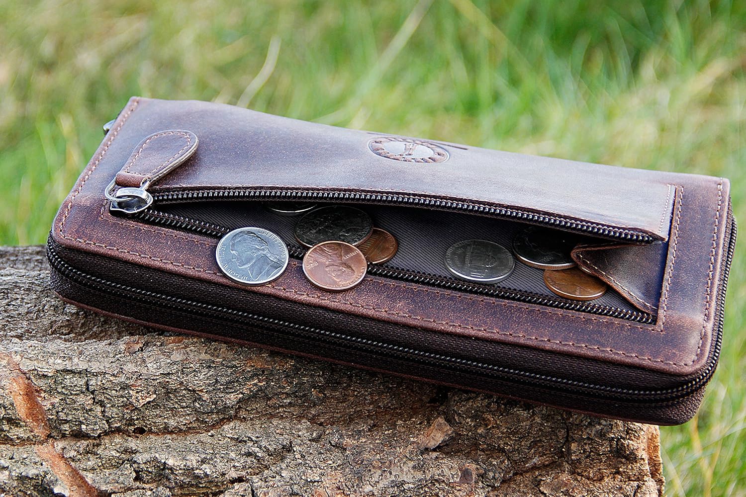 - VIEL PLATZ: Die Brieftasche aus echtem Leder bietet mit 16 Steckfächern, 4 Scheinfächern und einem grossen Münzgeldfach mit extra Reissverschluss eine Menge Platz. Auf der Aussenseite befindet sich ein zweites Reissverschlussfach. Masse der