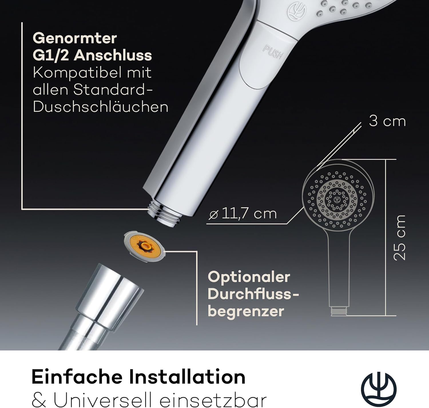 - EINFACHE INSTALLATION & UNIVERSAL EINSETZBAR: Werkzeuglose Montage und kompatibel mit allen Standard-Duschschläuchen dank genormtem G1/2 Anschluss.