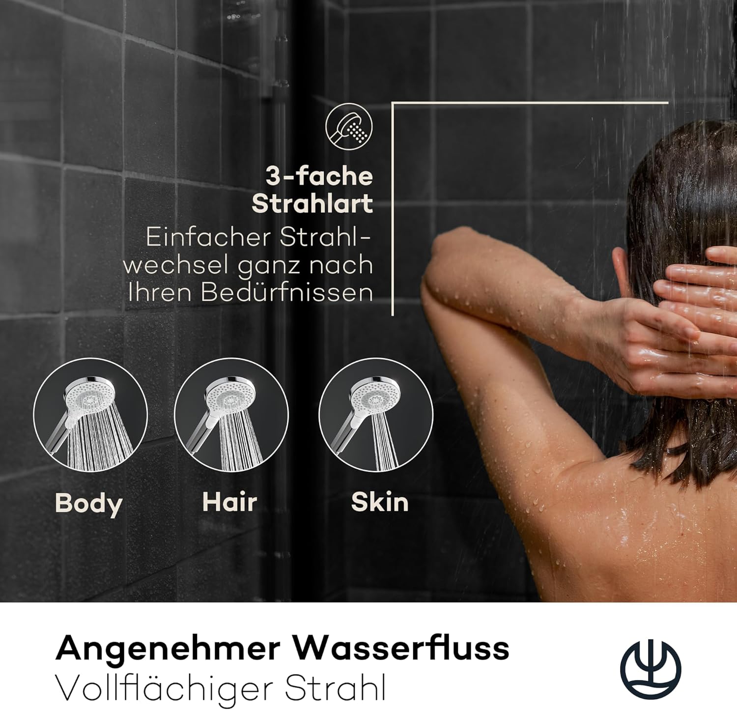 - VIELSEITIGE STRAHLARTEN & GROSSZÜGIGER DUSCHKOPF: Für ein personalisiertes Duscherlebnis wählen Sie auf Knopfdruck zwischen den neuartigen Strahlarten Body, Hair und Skin. Die Strahlart "Hair" befreit Haare schnell und effizient von Schaum. Der 11,7
