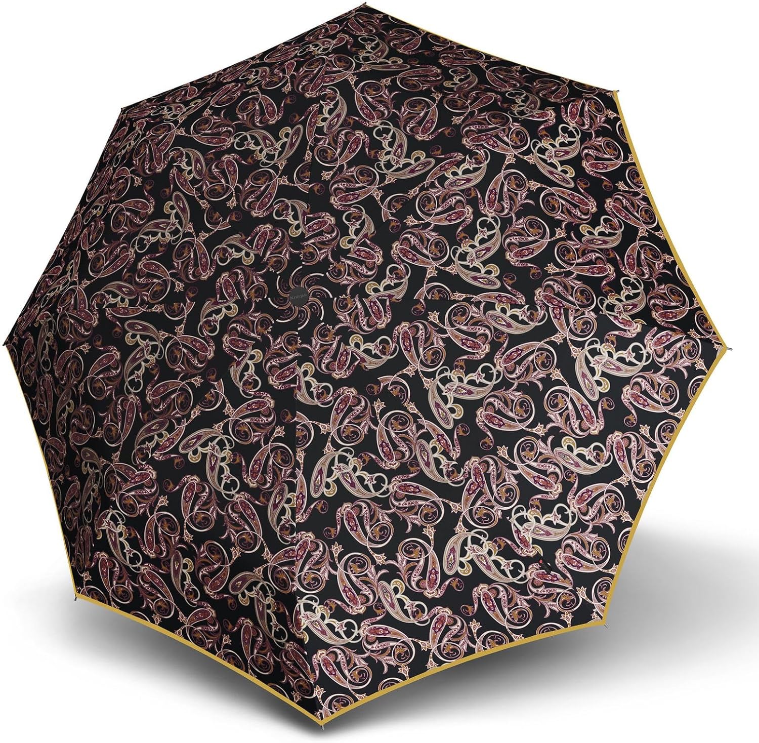 PRODUKTBESCHREIBUNGEN Knirps Regenschirm mit langem Stock Daten: o Masse geschlossen: Länge ca. 88 cm, Durchmesser ca. 5 cm o Masse offen: Länge Stiel ca. 75 cm, Durchmesser ca. 105 cm o Farbe: Amethyst (Bunt) o Gewicht: ca. 510 g o Material: Bezug 100% Polyester, Holzstock mit Klavierlack überzogen o Lieferumfang: Knirps Regenschirm mit Etikett Ausstattung: o Schirm öffnet automatisch per Knopfdruck o Rutschfester Schieber und lackierter Rundhakengriff o 8 Schienen Aufspannsystem mit Elementen aus Fiberglas und Stahl o Das Knirps Logo ist gut sichtbar eingearbeitet Knirps Stick Long AC Leaves - Der elegante Stockschirm Die Marke Knirps steht für Qualität und Funktionalität. Dies kann man bei dem Knirps Stick Long AC Leaves sehr gut erkennen. Der Regenschirm öffnet automatisch und lässt sich durch den lackierten Rundhakengriff bequem tragen. Durch sein Aufspannsystem, welches mit acht Schienen befestigt ist, ist der Knirps Schirm stabil und hält jedem Wetter stand. Ausserdem ist der Bezug in einem modischen Design eleganten Paisley gehalten, so lassen Sie trübes Regenwetter hinter sich.