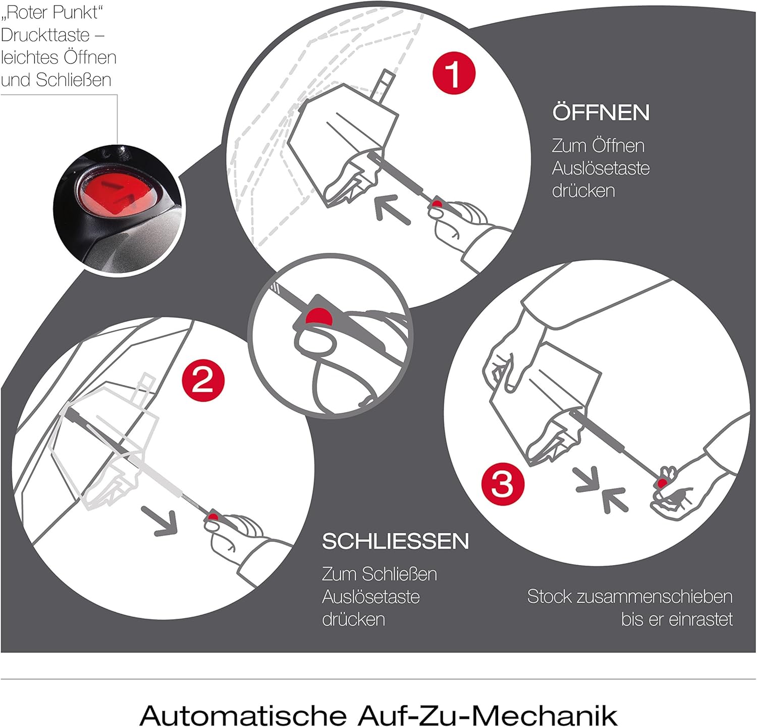 - KOMFORT durch leichtgängige Duomatic-Funktion (Auf- und Zu-Automatik). Grosser Auslösetaste verglichen mit vielen Mitbewerbern. Einfacheres Bedienen auch mit längeren Fingernägeln. Breites Schliessband erleichtert Zusammenlegen. Torsionsringe machen