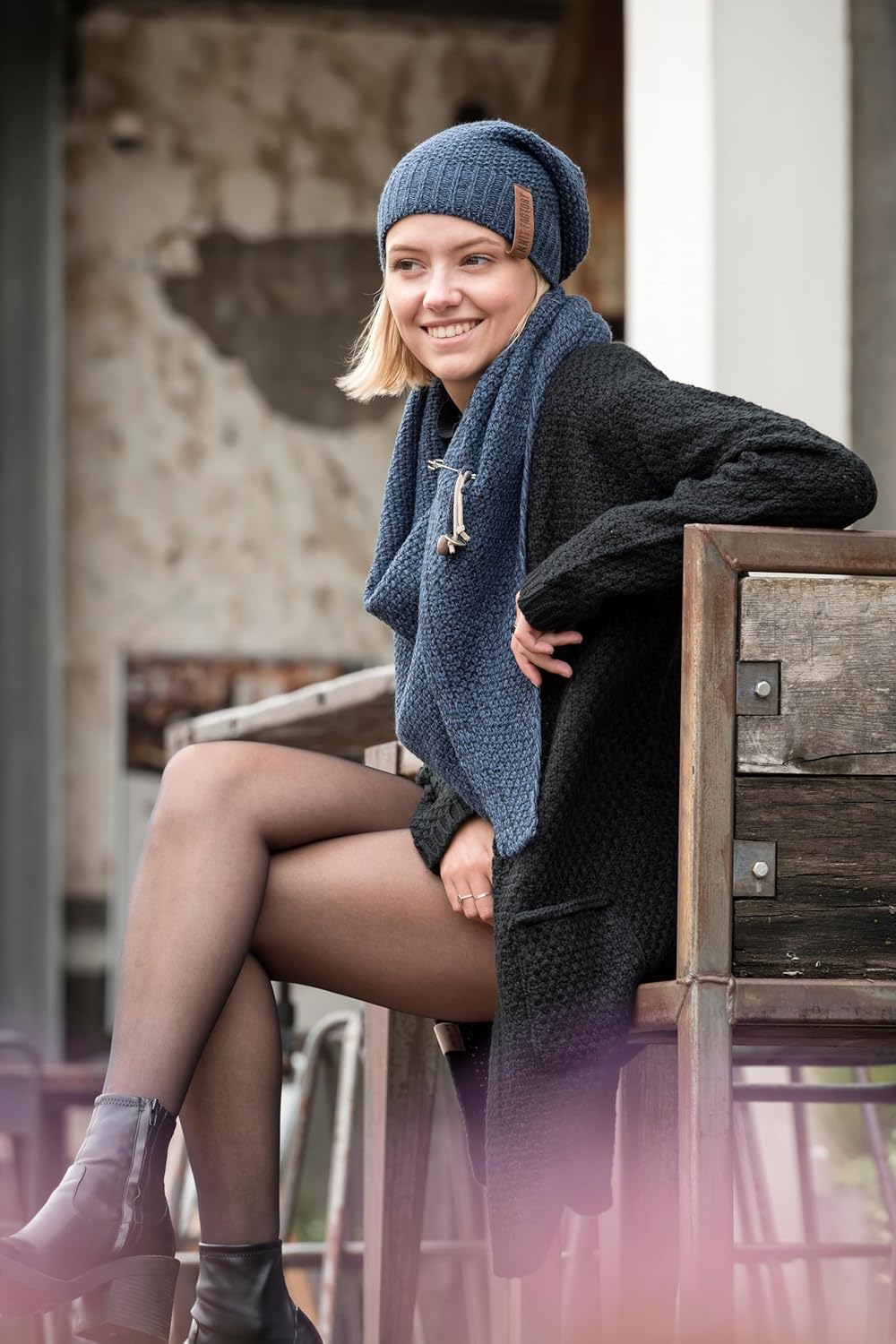 - [ Vegan Lederschlaufe & Sicherheitsnadel ] - Den letzten Schliff bei diesem hochwertigen Damen-Schal bilden die typische, moderne Knit Factory Lederschlaufe und die grosse Sicherheitsnadel mit passenden Details.