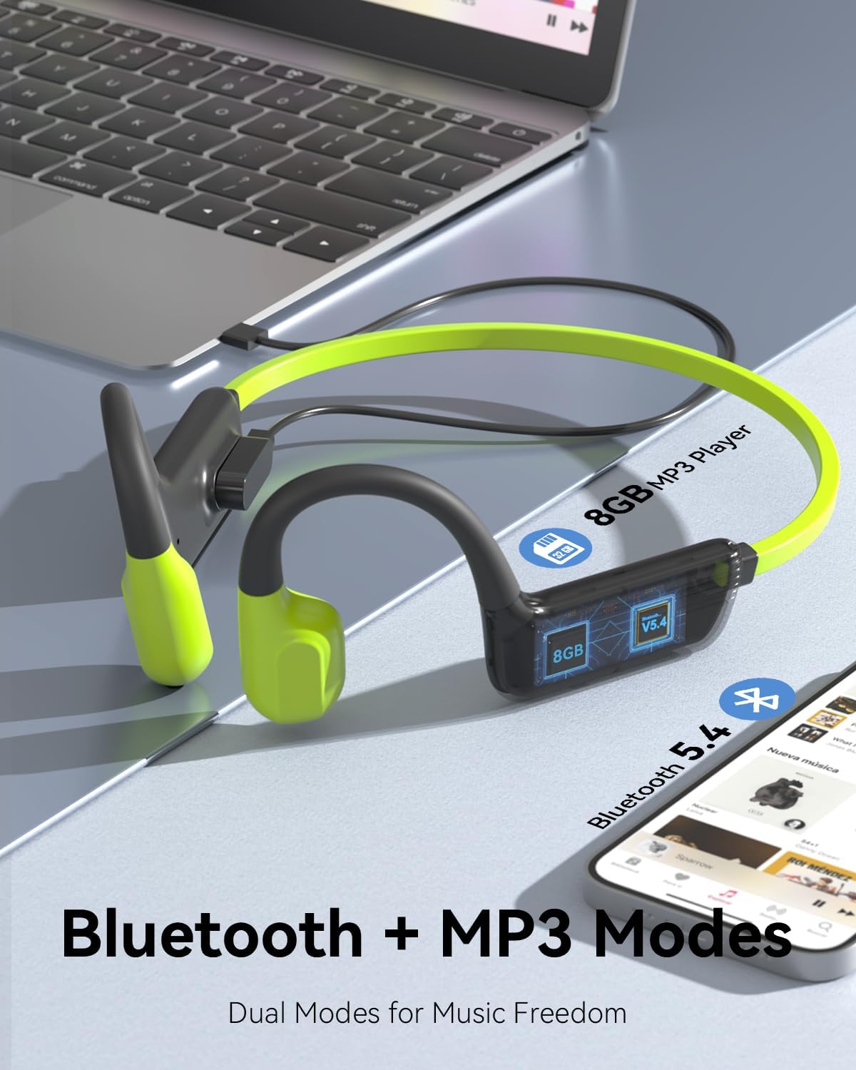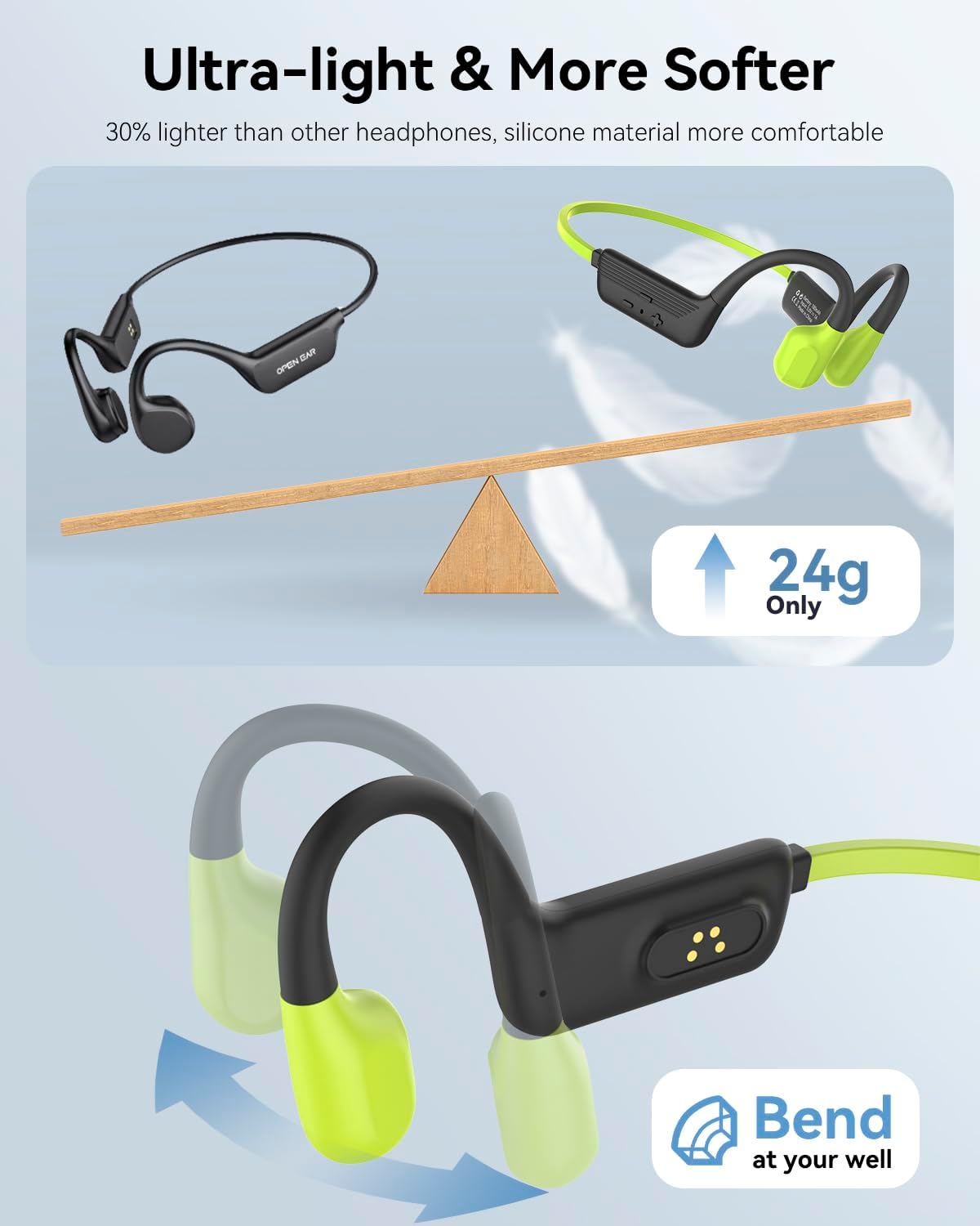 - [ Bluetooth 5.4 & leicht ] Der Knochenleitungskopfhörer verwendet den neuesten Bluetooth 5.4-Chip. Die Übertragungsgeschwindigkeit ist schneller und stabiler. Der kabellose Kopfhörer wiegt nur 24g und ist damit den ganzen Tag über sehr angenehm zu
