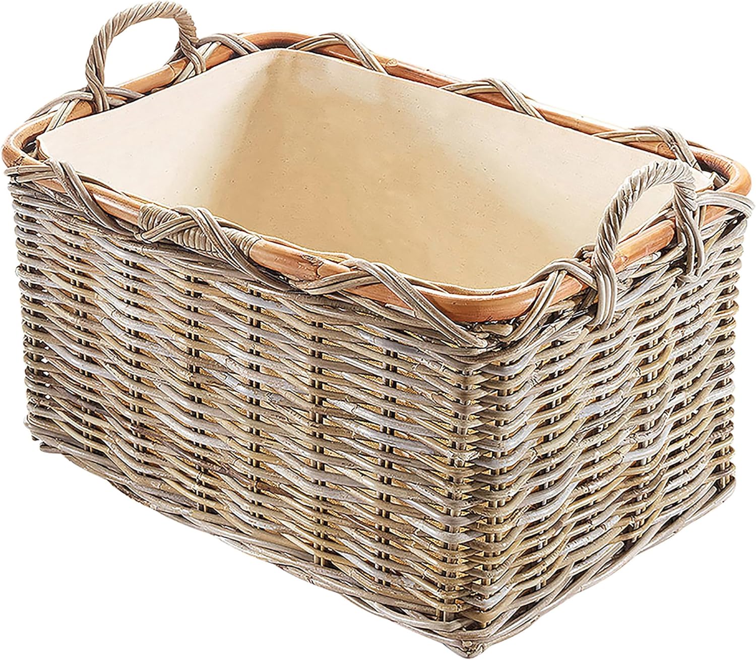 Kobolo Holzkorb für Kaminholz rechteckig Kubu grey aus Rattan mit Griffen und Leinen Kubu Grau Stoff